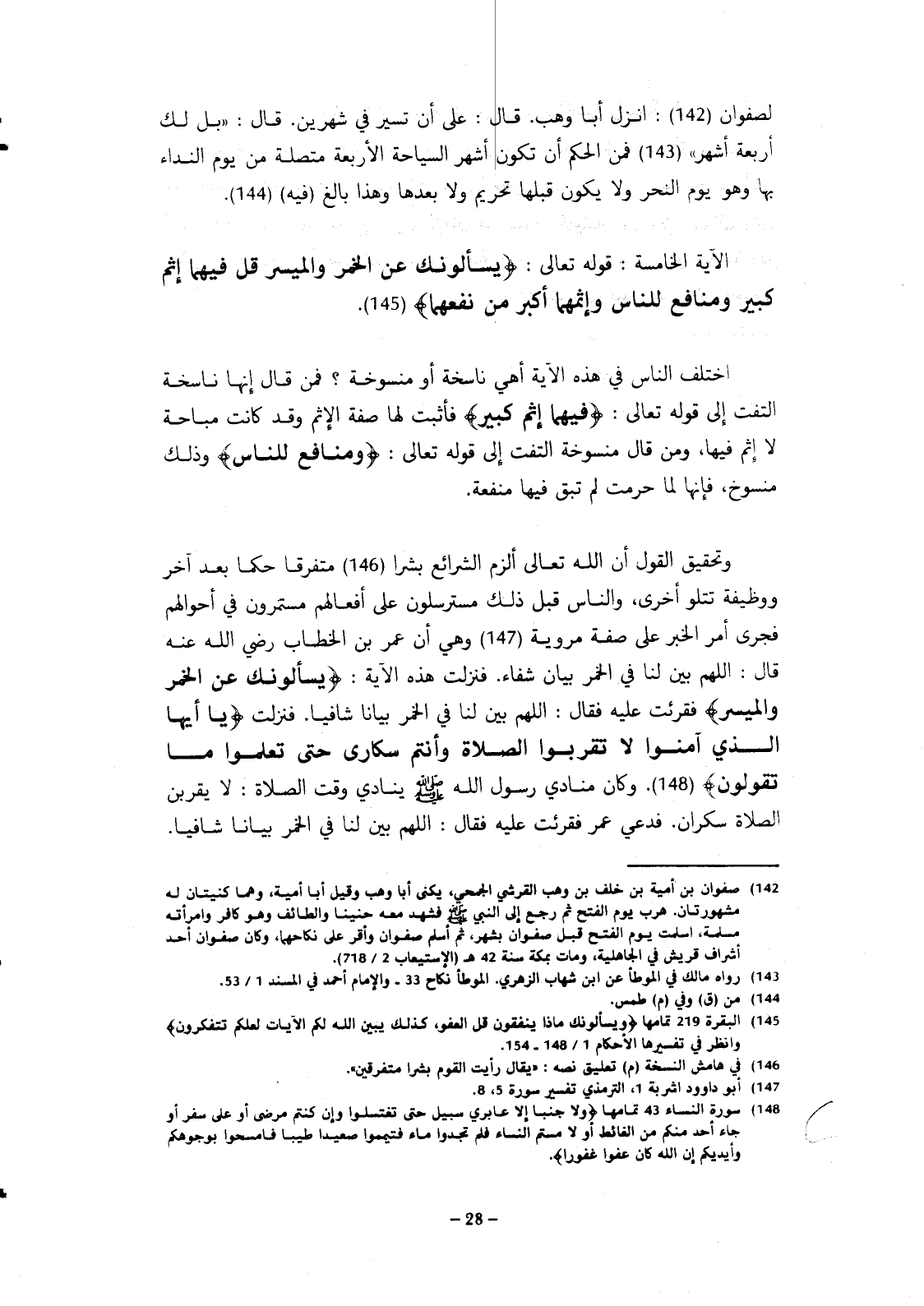وتحقيق القول أن الله تعالى ألزم الشرائع بشرا متفرقا حكما بعد آخر ووظيفته تتلو أخرى, والناس قبل ذلك مسترسلون على أفعالهم مستمرون في أحوالهم فجرى أمر الخبر على صفة مروية وهي أن عمر بن الخطاب رضي الله عنه قال: اللهم بين لنا في الخمر بيان شفاء. فنزلت هذه الآية: {يا أيها الذين آمنوا لا تقربوا الصلاة وأنتم سكارى حتى تعلموا ما تقولون}. وكان منادي رسول الله صلى الله عليه وسلم ينادي وقت الصلاة: لا يقربن الصلاة سكران. فدعي عمر فقرئت عليه فقال: اللهم بين لنا في الخمر بينا شافيا.