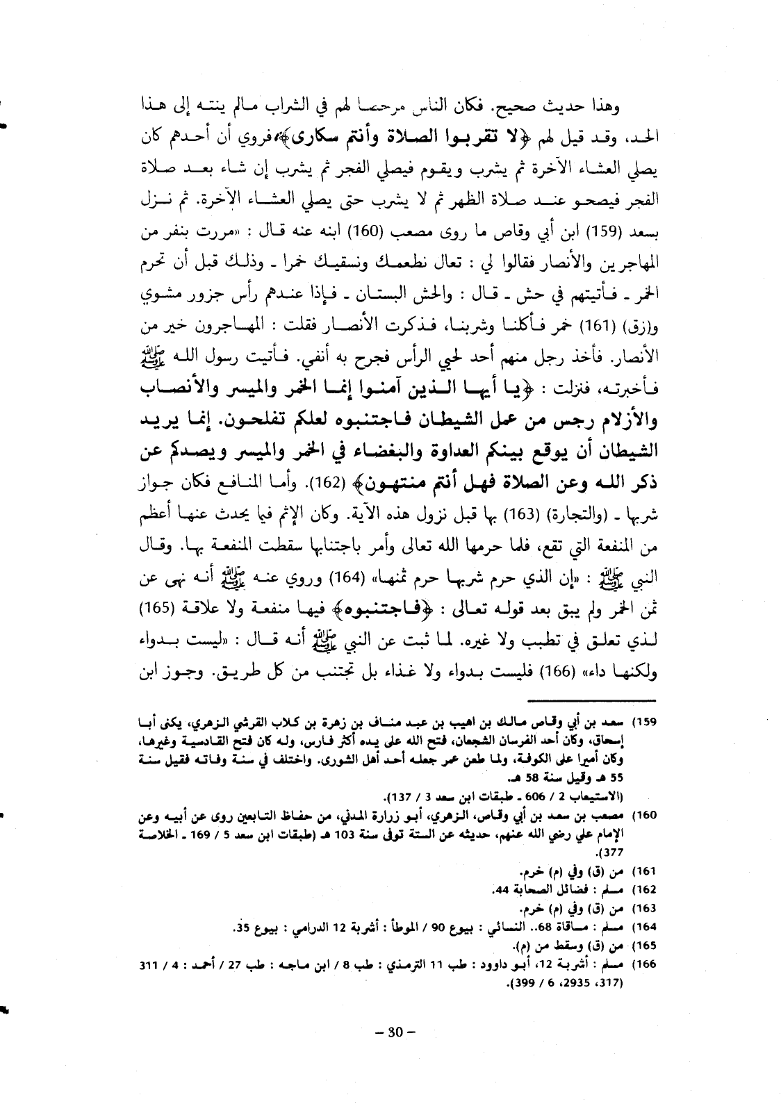 وهذا حديث صحيح. فكان الناس مرخصا لهم في الشراب مالم ينته إلى هذا الحد, وقد قيل لهم {لا تقربوا الصلاة وأنتم سكارى} فروي أن أحدهم كان يصلي العشاء الآخرة ثم يشرب ويقوم فيصلي الفجر ثم يشرب إن شاء بعد صلاة الفجر فيصحو عند صلاة الظهر ثم لا يشرب حتى يصلي العشاء الآخرة. ثم نزل بسعد ابن أبي وقاص ما روى مصعب ابنه عنه قال: "مررت بنفر من المهاجرين والأنصار فقالوا: تعال نطعمك ونسقيك خمرا ـــ وذلك قبل أن تحرم الخمر ــــ فأتيتهم في حش ـــ قال: والحش البستان ــــ فإذا عندهم رأس جزور مشوي و (زق) خمر فأكلنا وشربنا, فذكرت الأنصار فقلت: المهاجرون خير من الأنصار. فاخذ رجل منهم أحد لحيي الرأس فجرح به أنفي. فأتيت رسول الله صلى الله عليه وسلم فأخبرته, فنزلت: {يا أيها الذين آمنوا إنما الخمر والميسر والأنصاب والأزلام رجس من عمل الشيطان فاجتنبوه لعلكم تفلحون. إنما يريد الشيطان أن يوقع بينكم العداوة والبغضاء في الخمر والميسر ويصدكم عن ذكر الله وعن الصلاة فهل أنتم منتهون}. وأما المنافع فكان جواز شربها ـــ (والتجارة) بها قبل نزول هذه الآية. وكان الإثم فيما يحدث عنها أعظم من المنفعة التي تقع, فلما حرمها الله تعالى وأمر باجتنابها سقطت المنفعة بها. وقال النبي صلى الله عليه وسلم: "إن الذي حرم شربها حرم ثمنها" وروي عنه صلى الله عليه وسلم أنه نهى عن ثمن الخمر ولم يبق بعد قوله تعالى: {فاجتنبوه} فيما منفعة ولا علاقة لذي تعلق في تطبب ولا غيره. لما ثبت عن النبي صلى الله عليه وسلم أنه قال: " ليست بدواء ولكنها داء" فليست بدواء ولا غذاء بل تجتنب من كل طريق. وجوز ابن