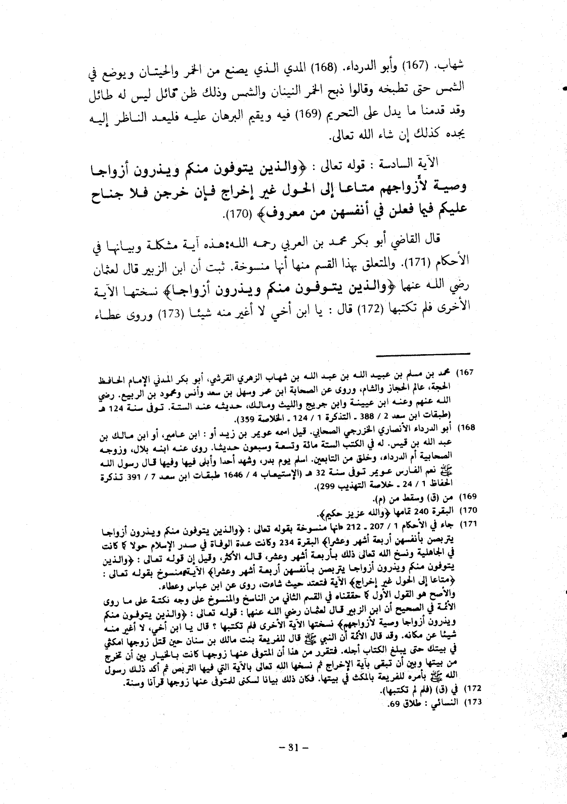 قال القاضي أبو بكر محمد بن العربي رحمه الله: هذه آية مشكلة وبيانها في الحكام. والمتعلق بهذا القسم منها أنها منسوخة. ثبت أن ابن الزبير قال لعثمان رضي عنهما {والذين يتوفون منكم ويذرون أزواجا} نسختها الآية الأخرى فلم تكتبها قال: ابن أخي لا أغير منه شيئا وروى عطاء