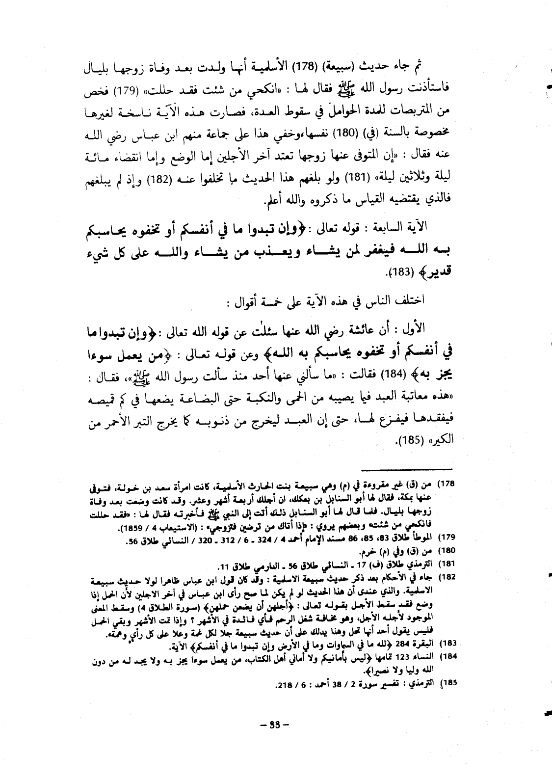 ثم جاء حديث (سبيعة) الأساسية أنها ولدت بعد وفاة زوجها بليال فاستأذنت رسول الله - صلى الله عليه وسلم - فقال لها: "انكحي من شئت فقد حللت" فخص من المتربصات للمدة الحوال في سقوط العدة, فصات هذه الآية ناسخة لغيرها مخصوصة بالسنة (في) نفسها, وخفي هذا على جماعة منهم ابن عباس - رضي الله عنه - فقال: "إن المتوفى عنها زوجها تعتد أخر الآجلين إما الوضع وإما انقضاء مائة ليلة وثلاثين ليلة" ولو بلغهم هذا الحديث ما تخلفوا عنه وإذ لم يبلغهم فالذي يقتضيه القياس ما ذكروه والله أعلم.