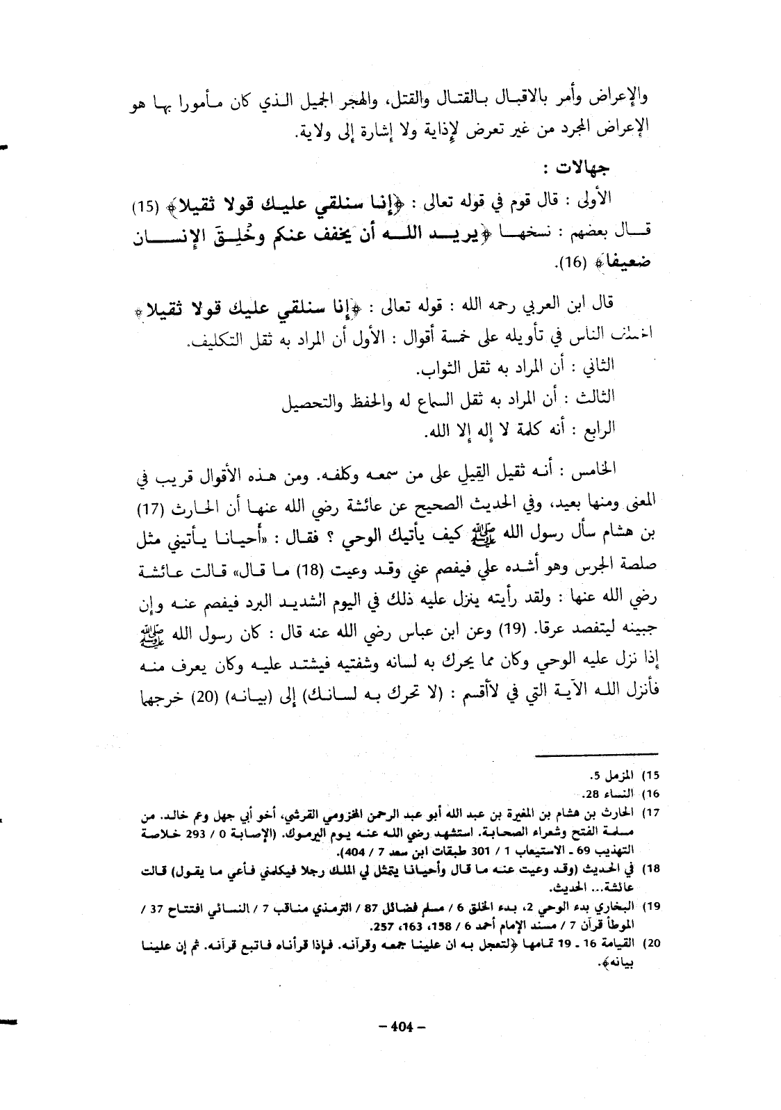 الخامس: أنه ثقيل القيل على من سمعه وكلفه. ومن هذه الأقوال قريب في المعنى ومنها بعيد وفي الحديث الصحيح عن عائشة رضي الله عنها أن الحارث بن هشام سأل رسول الله صلى الله عليه وسلم كيف يأتيك الوحي؟