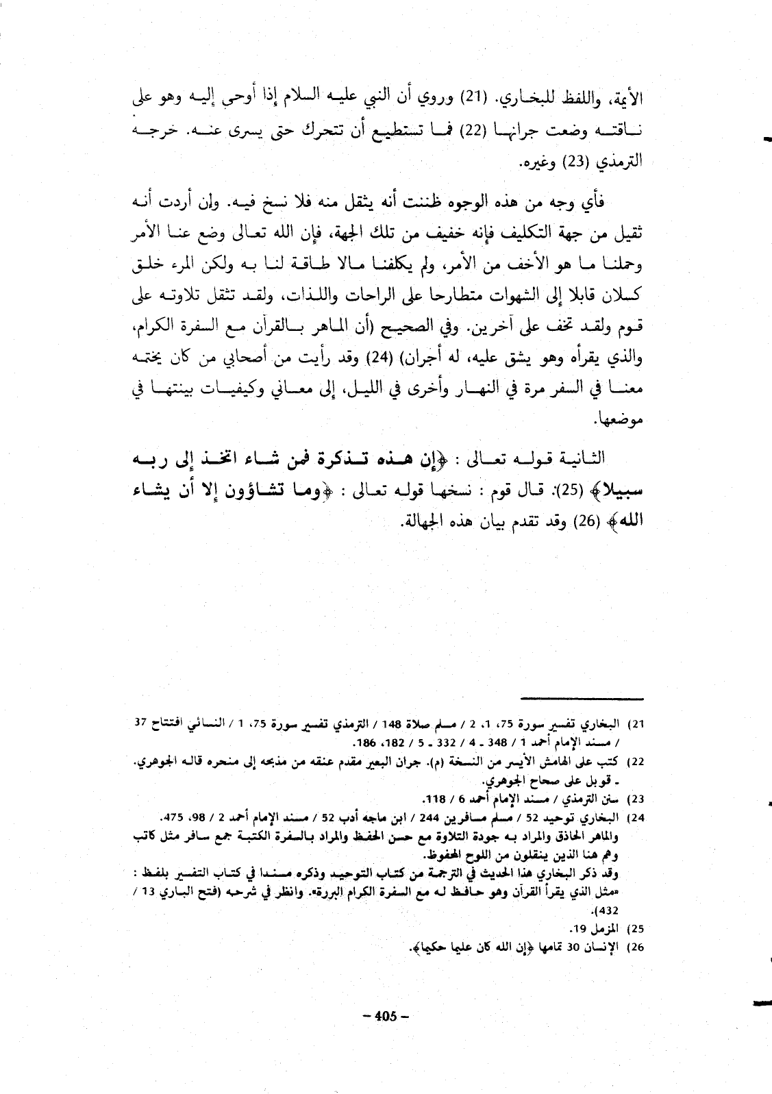 فأي وجه من هذه الوجوه ظنننت أنه يثقل منه فلا نسخ فيه. وأن أردت أنه ثقيل من جهة التكليف فإنه خفيف من تلك الجهة، فإن الله تعالى وضع عنا الأمر وحملنا ما هو الأخف من الأمر، ولم يكلفنا ما لا طاقة لنا به ولكن المرء خلق كسلان قابلا إلى الشهوات متطارحا على الراحات واللذات. ولقد تثقل تلاوته على قوم ولقد تخف على آخرين. وفي الصحيح أن الماهر بالقرآن مع السفرة الكرام والذي يقرأه وهو يشق عليه له أجران، وقد رأيت من أصحابي من كان يختمه معنا في السفر مرة في النهار وأخرى في الليل، إلى معاني وكيفيات بينتها في موضعها.