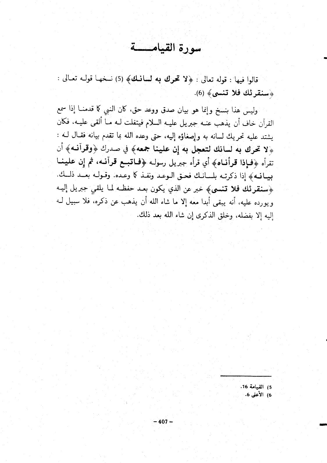 وليس هذا بنسخ وإنما هو بيان صدق ووعد حق، كان النبي كما قدمنا إذا سمع القرآن خاف أن يذهب عنه جبريل عليه السلام فيتفلت له ما ألقي عليه، فكان يشتد عليه تحريك لسانه به وإصغاؤه إليه، حتى وعده الله بما تقدم بيانه فقال له: {لا تحرك به لسانك لتعجل به إن علينا جمعه} في صدرك {وقرآنه} أن تقرأه {فإذا قرأناه} أي قرأه جبريل رسوله {فاتبع قرآنه، ثم إن علينا بانه} إذا ذكرته بلساك فحق الوعد ونفذ كما وعده، وقوله بعد ذلك {سنقرئك فلا تنسى} خبر عن الذي يكون بعد حفظه لما يلقى جبريل إليه ويورده عليه، أنه يبقى أبدًا معه إلا ما شاء الله أن يذهب عن ذكره، فلا سبيل له إليه إلا بفضله، وخلق الذكرى إن شاء الله بعد ذلك.