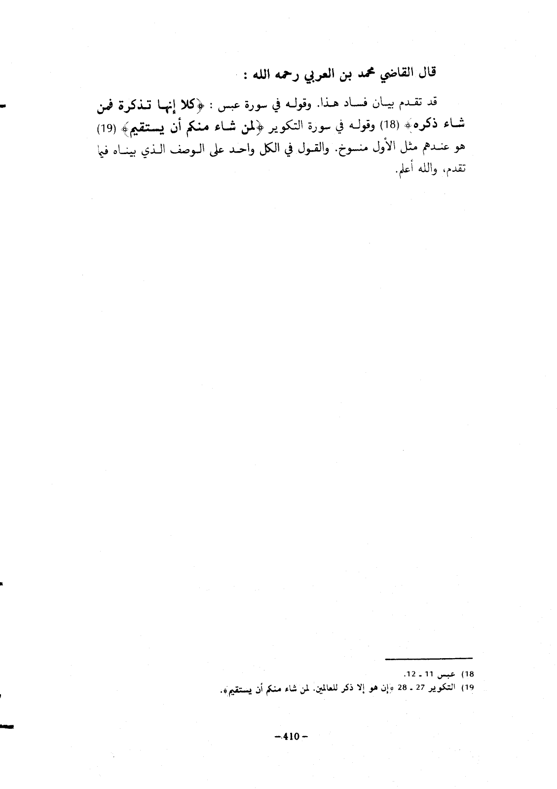 قد تقدم بيان فساد هذا. وقوله في سورة عبس: {كلا إنها تذكرة فمن شاء ذكره} وقوله في سورة التكوير: {لمن شاء منكم أن يستقيم} هو عندهم مثل الأول منسوخ. والقول في الكل واحد على الوصف الذي بيناه فيما تقدم والله أعلم.