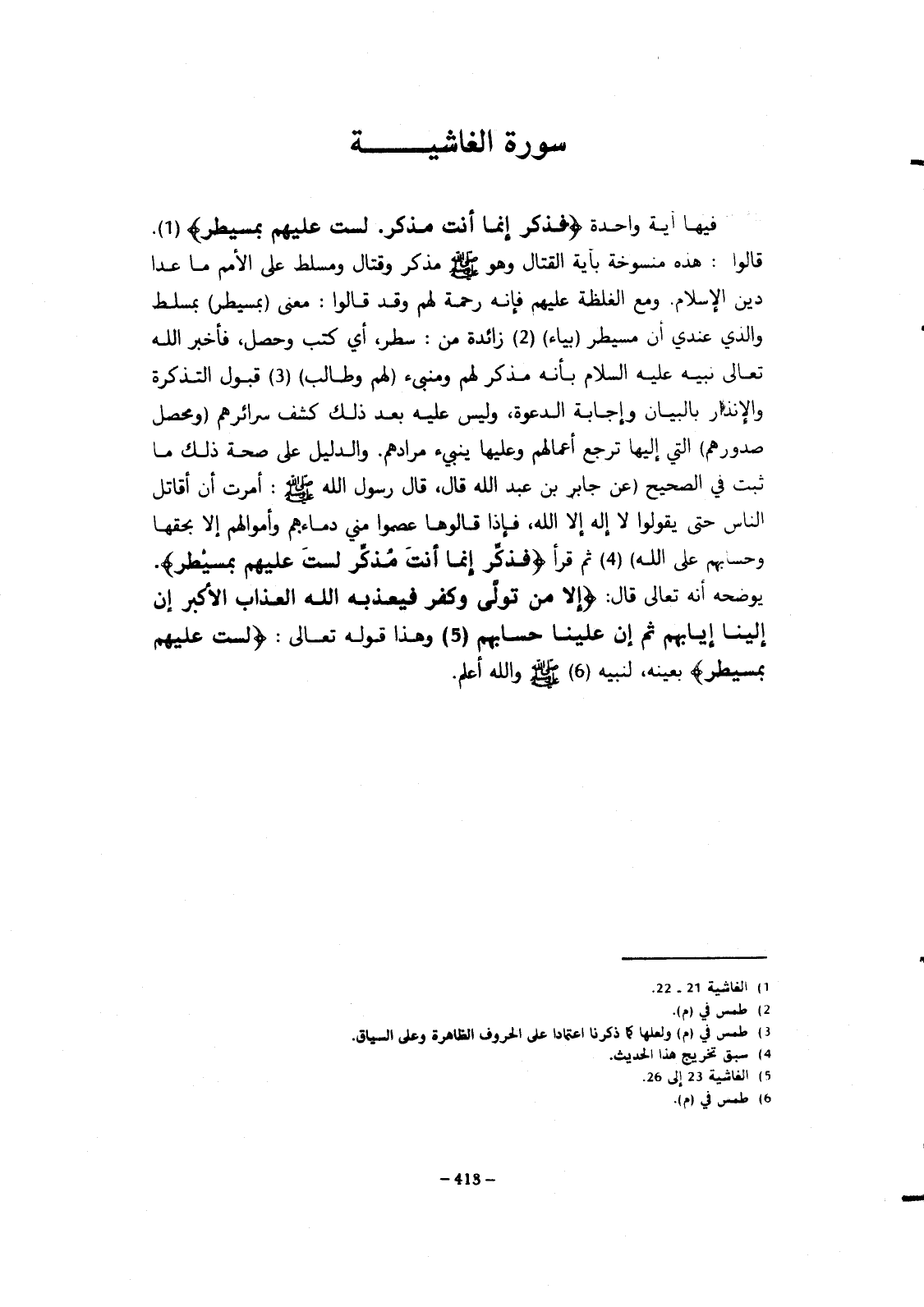 فيها آية واحدة {فذكر إنما أنت مذكر، لست عليهم بمسيطر} قالوا: هذه منسوخة بآية القتال وهو صلى الله عليه وسلم مذكر وقتال ومسلط على الأمم ما عدا دين الإسلام، ومع الغلظة عليهم فإنه رحمة لهم وقد قالوا: معنى بمسيطر بمسلط والذي عندي أن مسيطر بياء زائدة من سطر، أي كتب وحصل، فأخبر الله تعالى نبيه عليه السلام بأنه مذكر لهم ومنبيء لهم وطالب قبول التذكرة والإنذار بالبيان وإجابة الدعوة، وليس عليه بعد ذلك كشف سرائرهم ومحصل صدروهم، التي إليها ترجع أعمالهم وعليها ينبيء مرادهم. والدليل على صحة ذلك ما ثبت في الصحيح عن جابر بن عبد الله قال قال رسول الله صلى الله عليه وسلم أمرت أن أقاتل الناس حتى يقولوا لا إله إلا الله، فإذا قالوها عصموا مني دماءهم وأموالهم إلا بحقها وحسابهم على الله، ثم قرأ {فذكر إنما أنت مذكر لست عليهم بمسيطر} يوضحه أنه تعالى قال: {إلا من تولى وكفر فيعذبه الله العذاب الأكبر إن إلينا إيابهم ثم إن علينا حسابهم} وهذا قوله تعالى: {لست عليهم بمسيطر} بعينه، لنبيه صلى الله عليه وسلم والله أعلم.