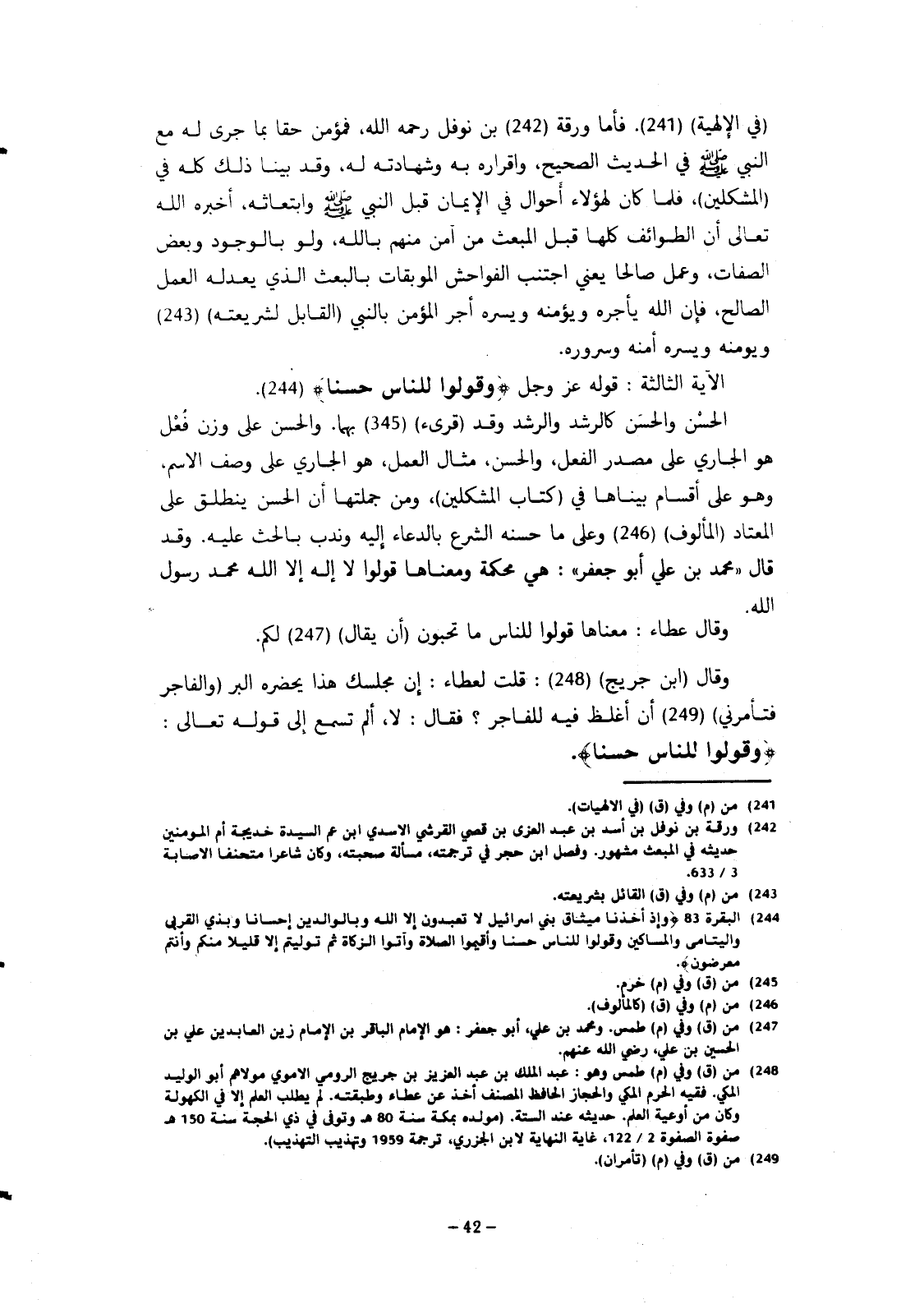(في الإلهية). فأما ورقةبن نوفل رحمه الله، فمؤمن حقابما جرى له معالنبي صلى الله عليه وسلم في الحديث الصحيح، واقراره به وشهادته له، وقد بينا ذلك كله في (المشكلين)، فلما كان لهؤلاء أجوال في الإيمان قبل النبي صلى الله عليه وسلام وابتعاثه، أخبره اللهتعالى أن الطوائف كلها قبل المبعث من آمن منهم بالله، ولو بالوجود وبعض الصفات، وعمل صالحا يعني اجتنب الفواحش والموبقات بالبعث الذي يعدله العملالصالح، فإن الله يأجره ويؤمنه ويسره أجر المؤمن بالنبي (القابل لشريعته) ويومنه ويسره أمنه وسروره.