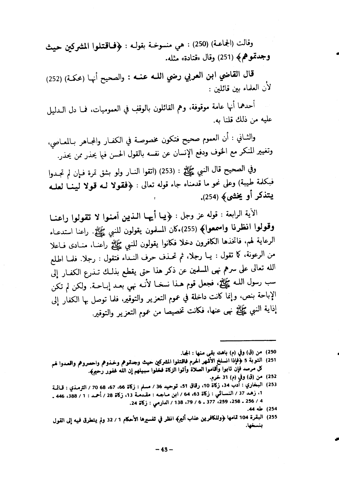 وقالت (الجماعة): هي منسوخة بقوله: {فاقتلوا المشركين حيث