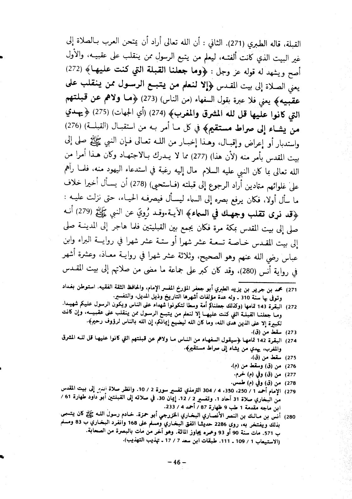 القبلة قاله الطبري. الثاني: أن الله تعالى أراد أن يمتحن العرب بالصلاة إلىغير البيت الذي كانت ألفته، ليعلم من يتبع الرسول ممن ينقلب على عقبيه، والأول أصح ويشهد له قوله عز وجل {وماجعلنا القبلة التي كنت عليها} يعني الصلاة إلى بيت المقدس {إلا لنعلم من يتبع الرسول ممن ينقلب علىعقبيه} يعني فلا عبرة بقول السفهاء (من الناس) {ما ولاهم عن قبلتهمالتي كانوا عليها قل لله المشرق والمغرب} (أي الجهات) {يهديمن يشاء إلى صراط مستقيم} في كل ما أمر به من استقبال (القبلة) واستدبار أو إعراض وإقبال، وهذا إخبار من الله تعال فإن النبي صلى الله عليه وسلم إلىبيت المقدس بأمر منه (لأن هذا) مما لايدرك بالاجتهاد وكان هذا أمرا منالله تعالى بما كان النبي عليه السلام مال إليه غبة في استدعاء اليهود منه، فلما رآهنعلى غلوائهم متمادين أراد الرجوع إلى قبلته (فاستحي) أم يسأل أخيرا خلاف ماسأل أولا، فكان يرفع بصره إلى السماء ليسأل فيصرفه الحياء، حتى نزلت عليه: