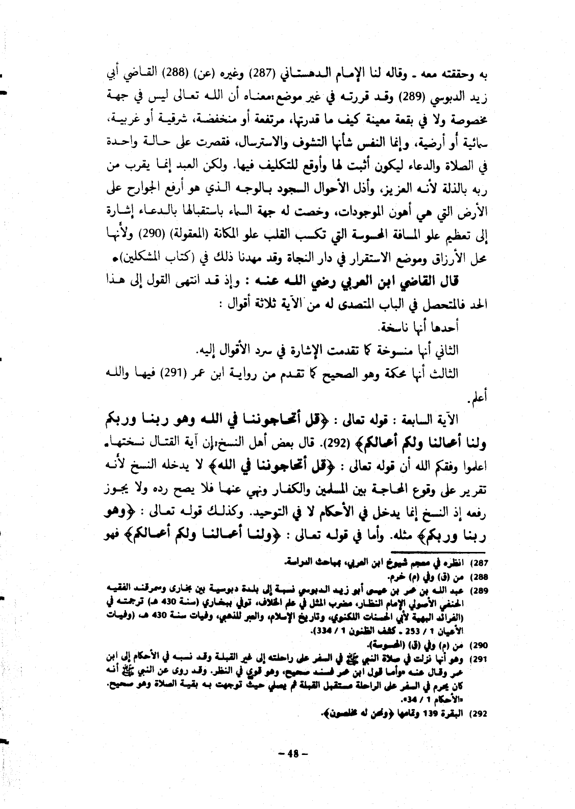 به وحققته معه_ وقاله لنا الإمام الدهستاني وغيره (عن) القاضي أبيزيد الدبوسيوقد قررته في غير موضع ,معناه أن الله تعالىليس في جهة مخصوصة ولا في بقعة معينة كيف ما قدرتها، مرتفع أو منخفضة، شرقية أو غربية، سمائية أو أرضية، وإنما النفس شأنها التشوف والاسترسال، فقصرت على حالة واحدةفي الصلاة والدعاء ليكون أثبت لها وأوقع للتكليف فيها. ولكن العبد إنما يقرب من ربه بالذلة لأنه العزيز، وأذل الأحوال السجود بالوجه الذي هو أرفع الجوارح علىلأرض التي هي أهون الموجودات، وخصت له جهة السماء باستقبالها بالدعاء إشارةإلى تعظيم علو المسافة المحسوسة التي تكسب القلب علو المكانة (المعقولة) ولأنهامحل الأرزاق وموضع الاستقرار في دار النجاة وقد مهدنا ذلك في (كتاب المشكلين)