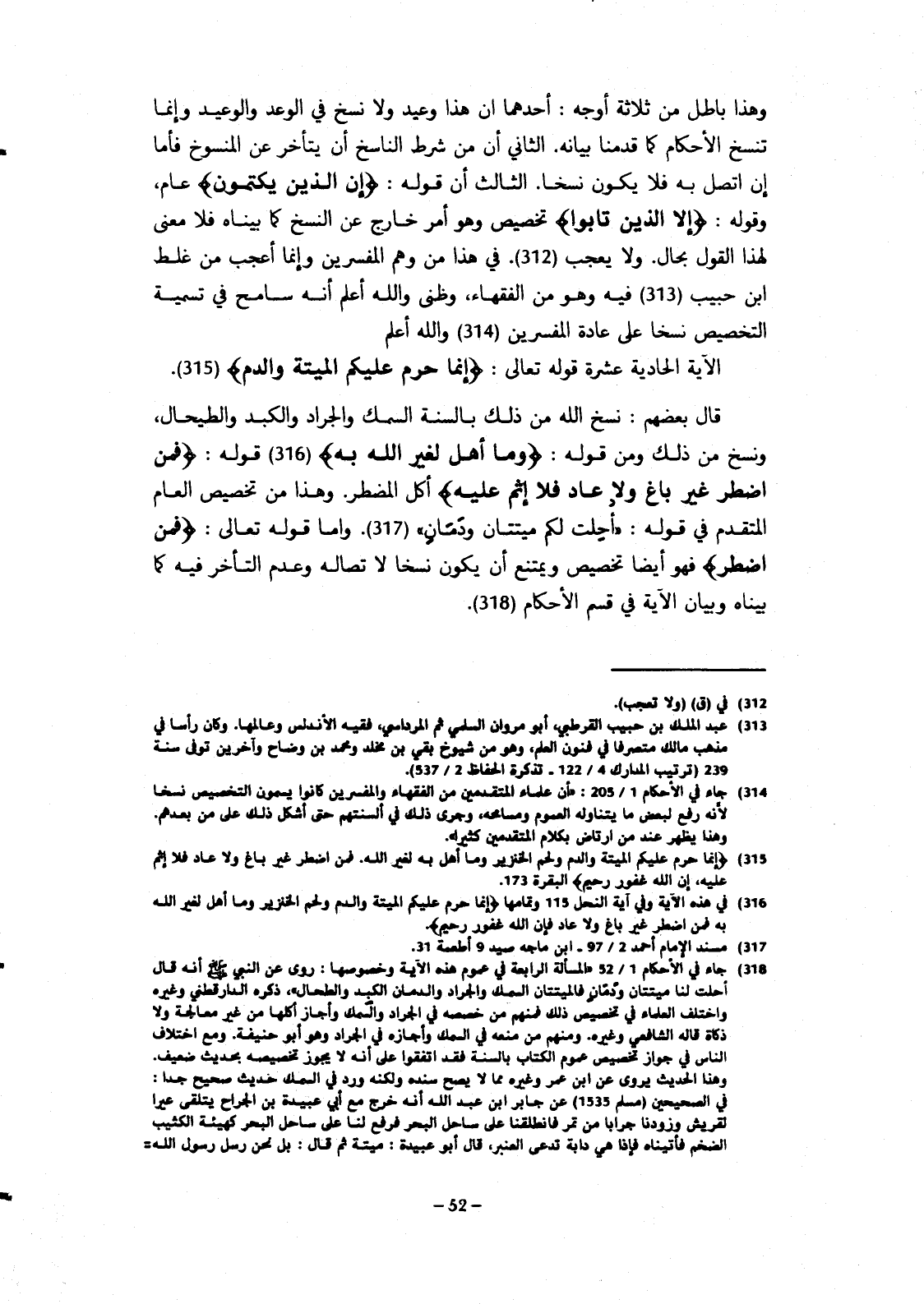 قال بعضهم: نسخ الله من ذلك بالسنة السمك والجراد والكبد والطحال، ونسخ من ذلك ومن قوله: {وما أهل لغير الله به} قوله: {فمن اضطر غير باغ ولا عاد فلا إثم عليه} أكل المضطر. وهذا من تخصيص العام المتقدم في قوله: " أحلت لكم ميتتان ودمان" وإما قوله تعالى: {فمن اضطر} فهو أيضا تخصيص ويمتنع أن يكون نسخا لاتصاله وعدم التأخر فيه كما بيناه وبيان الآية في قسم الأحكام.