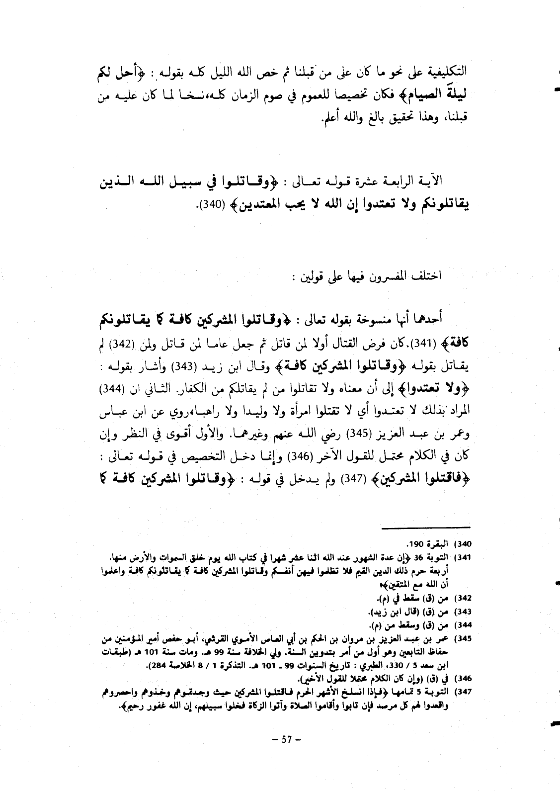 الآية الرابعة عشرة قوله تعالى: {وقاتلوا في سبيل الله الذين يقاتلونكم ولا تعتدوا إن الله لا يحب المعتدين}.