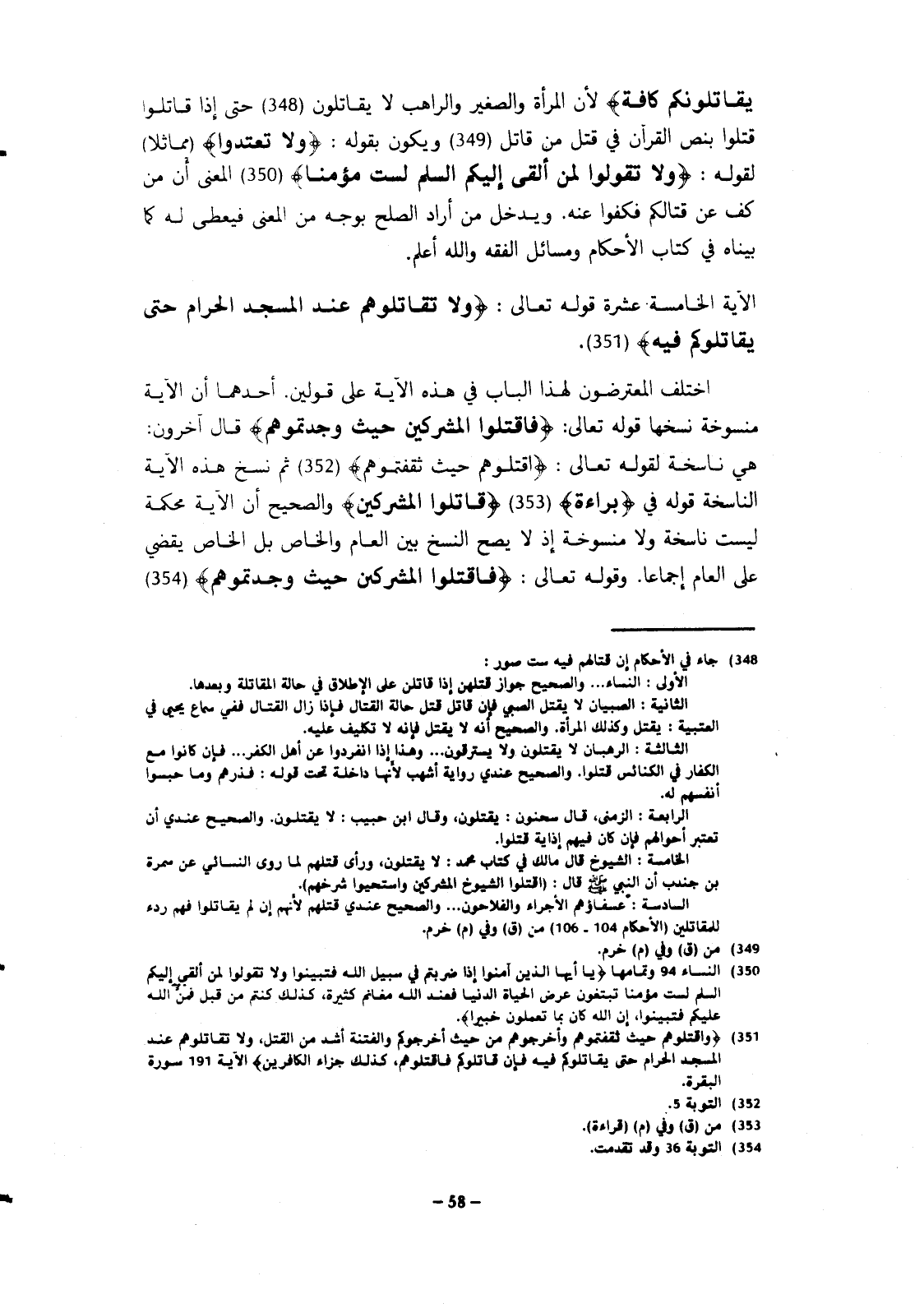 اختلف المعترضون لهذا الباب في هذه الآية على قولين: أحدهما أن الآية منسوخة نسخها قوله تعالى: {فاقتلوا المشركين حيث وجدتموهم} قال آخرون: هي ناسخة لقوله تعالى: {اقتلوهم حيث ثقفتموهم} ثم نسخ هذه الآية الناسخة قوله في {براءة} {قاتلوا المشركين} والصحيح أن الآية محكمة ليست ناسخة ولا منسوخة إذ لا يصح النسخ بين العام والخاص بل الخاص يقضى على العام إجماعا، وقوله تعالى: {فاقتلوا المشركين حيث وجدتموهم}.