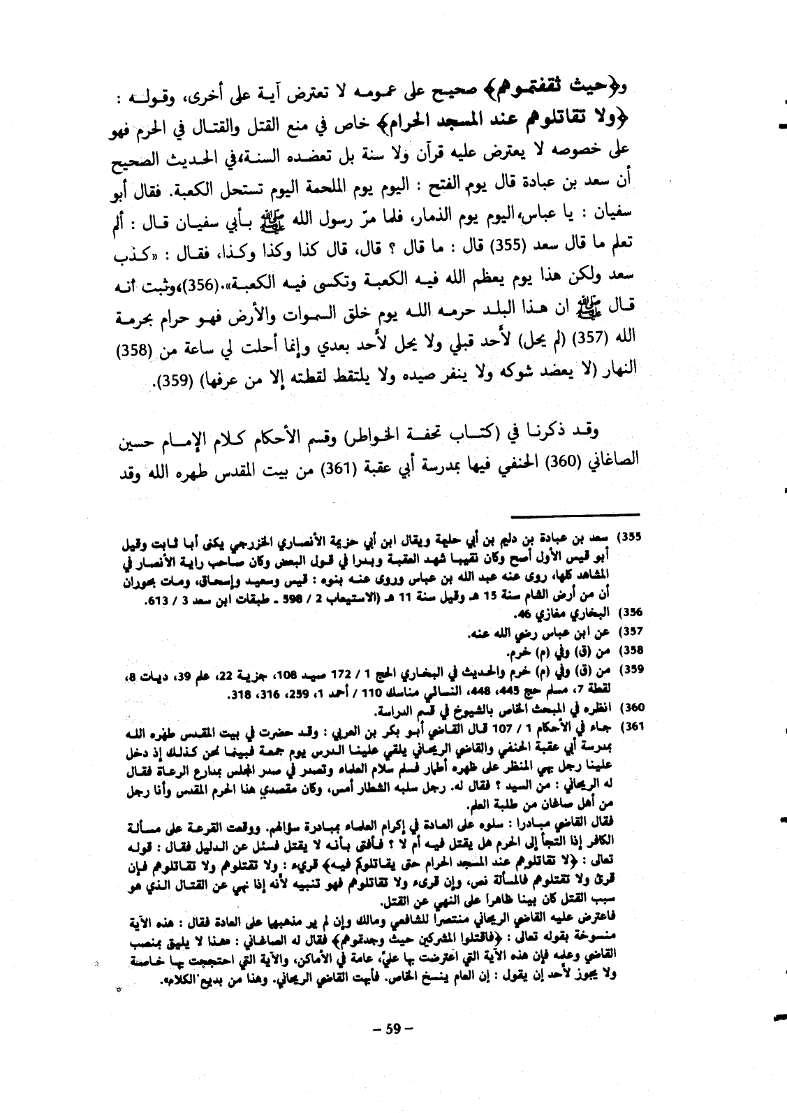 و {حيث ثقفتموهم} صحيح على عمومه لا تعترض آية على أخرى، وقوله: {ولا تقاتلوهم عند المسجد الحرام} خاص في منع القتل والقتال في الحرم فهو على خصوصه لا يعترض عليه قرآن ولا سنة بل تعضده السنة في الحديث الصحيح أن سعد بن عبادة قال يوم الفتح: اليوم يوم الملحمة اليوم تستحل الكعبة. فقال أبو سفيان: يا عباس اليوم يوم الذمار، فلما مر رسول الله صلى الله عليه وسلم بأبي سفيان قال: ألم تعلم ما قال سعد قال: ما قال؟ قال: قال كذا وكذا وكذا، فقال: " كذب سعد ولكن هذا يوم يعظم الله فيه الكعبة وتكسى فيه الكعبة" وثبت أنه قال صلى الله عليه وسلم إن هذا البلد حرمه الله يوم خلق السماوات والأرض فهو حرام بحرمة الله (لم حل) لأحد قبلي ولا يحل لأحد بعدي وإنما أحلت لي ساعة من النهار (لا يعضد شوكه ولا ينفر صيده ولا يلتقط لقطته إلا من عرفها).
