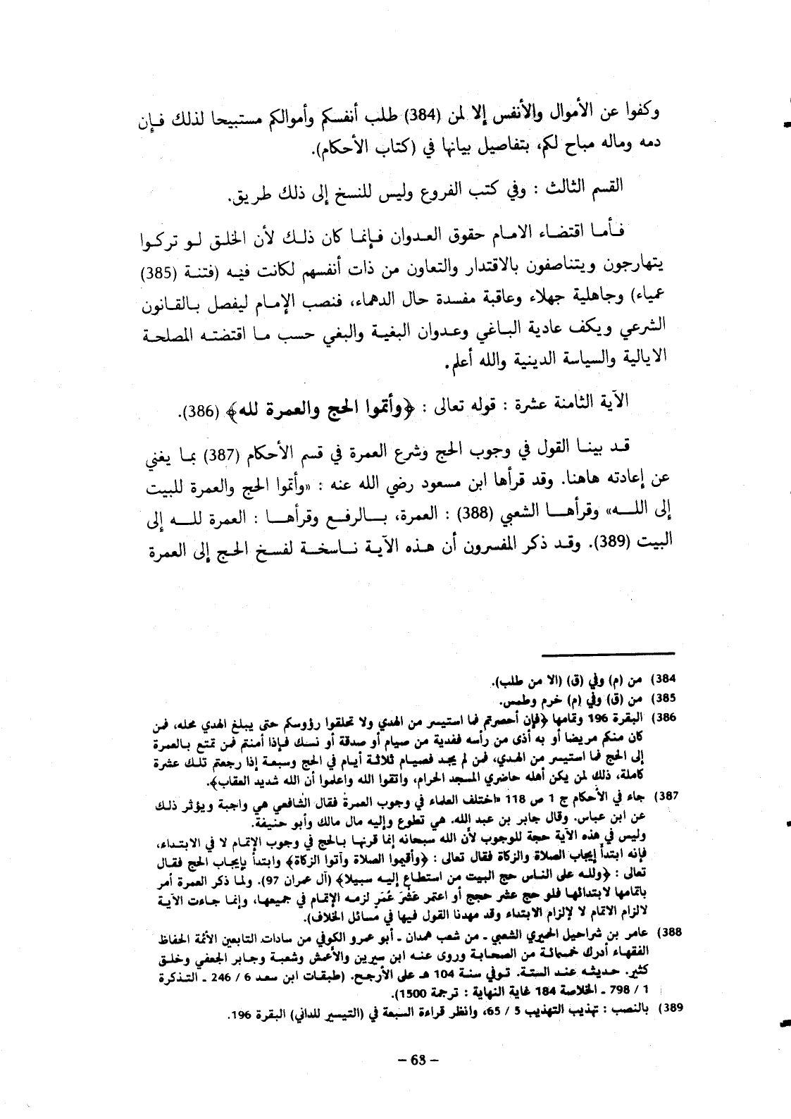 قد بينا القول في وجوب الحج وشرع العمرة في قسم الأحكام بما يغني على إعادته ها هنا، وقد قرأها ابن مسعود رضي الله عنه: "وأتموا الحج والعمرة للبيت" وقرأها الشعبي: العمرة، بالرفع وقرأها: العمرة لله إلى البيت، وقد ذكر المفسرون أن هذه الآية ناسخة لفسخ الحج إلى العمرة