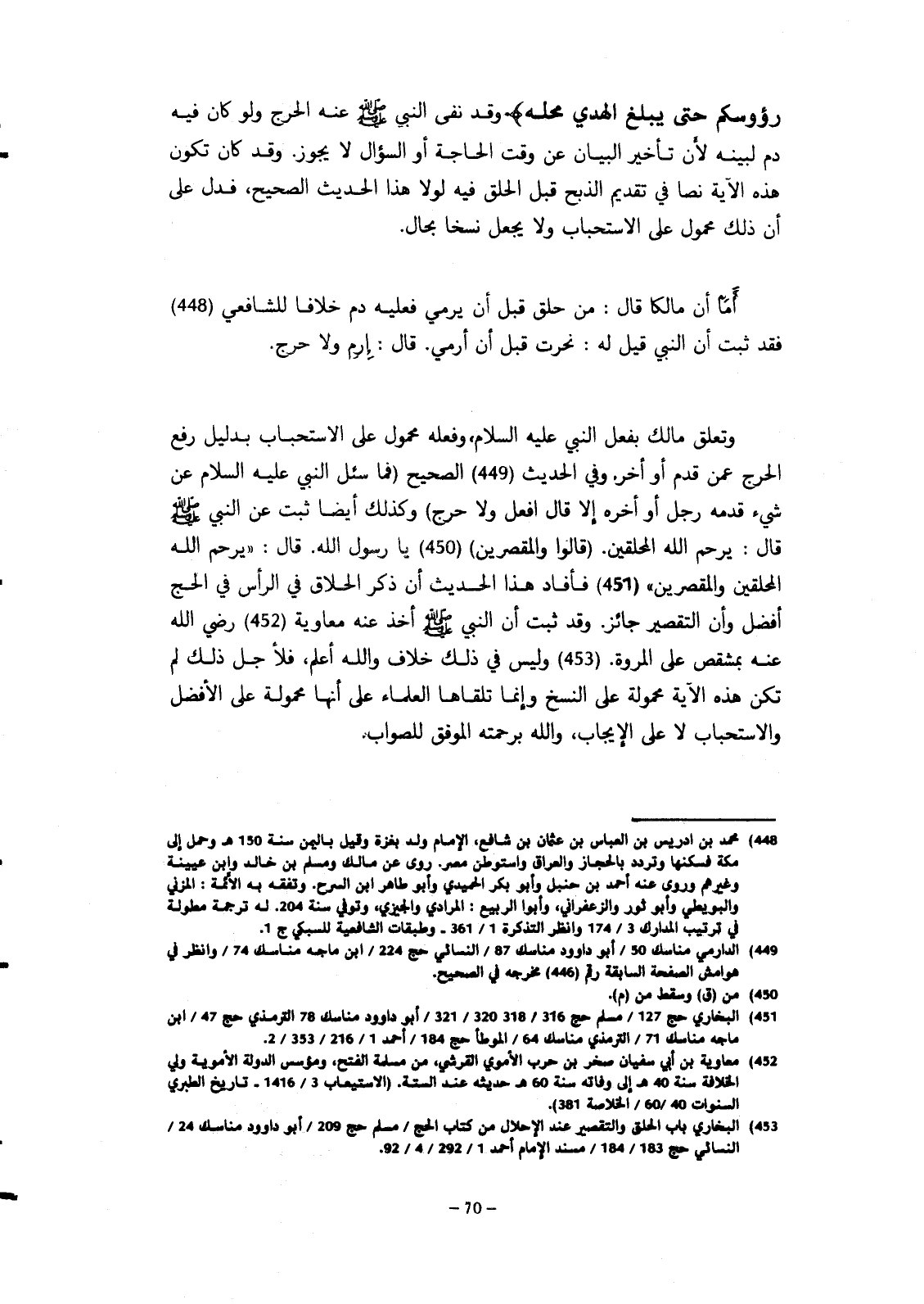 رؤوسكم حتى يبلغ الهدي محله} وقد نفي النبي صلى الله عليه وسلم عنه الحرج ولو كان فيه دم لبينه لأن تأخير البيان عن وقت الحاجة أو السؤال لا يجوز. وقد كان تكون هذه الآية نصا في تقديم الذبح قبل الحلق فيهل ولا هذا الحديث الصحيح، فدل على أن ذلك محمول على الاستحباب ولا يجعل نسخا بحال.