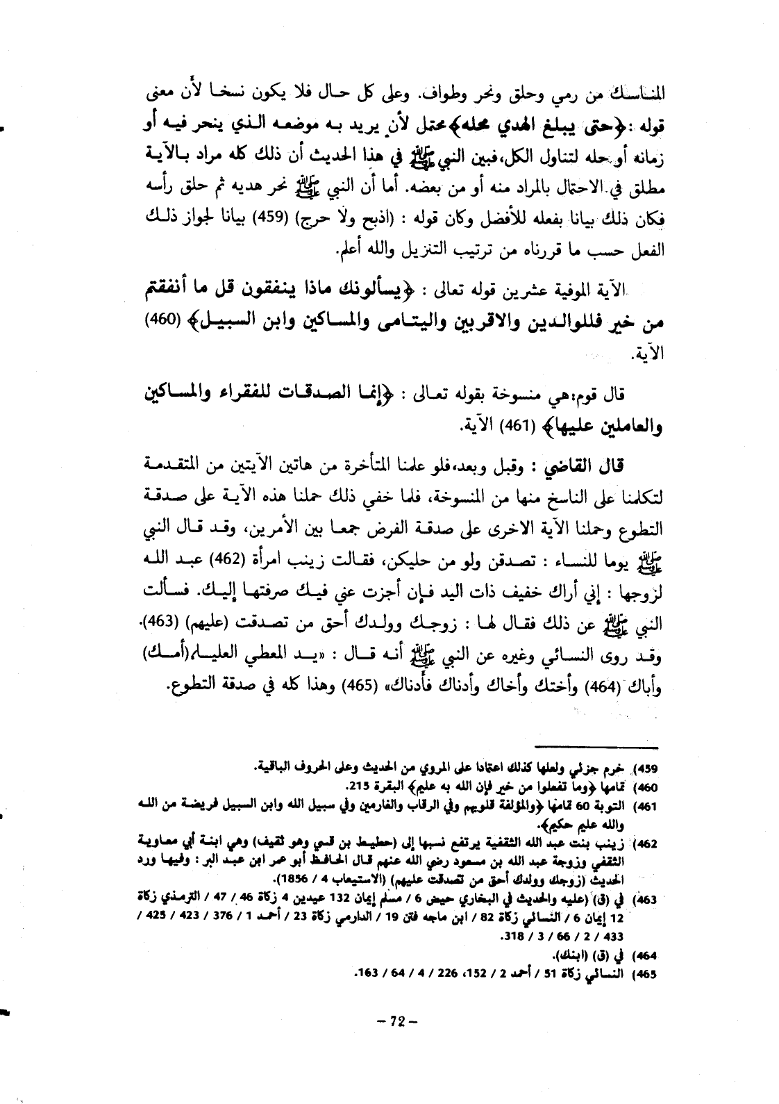 قال القاضي: وقبل وبعد، فلو علمنا المتاخر من هاتين الآيتين من المتقدمة لتكلمنا على الناسخ منها من المنسوخة فلما خفي ذلك حملنا هذه الآية على صدقة التطوع وحملنا الآية الأخرى على صدقة الفرض جمعا بين الأمرين، وقد قال النبي صلى الله عليه وسلم يوما للنساء: تصدقن ولو من حليكن، فقال زينب امرأة عبد الله لزوجها: إني أراك خفيف ذات اليد فإن أجزت عني فيك صرفتها إليك، فسألت النبي صلى الله عليه وسلم عن ذلك فقال لها زوجك وولدك أحق من تصدقت عليهم، وقد روى النسائي وغيره عن النبي صلى الله عليه وسلم أنه قال: يد المعطي العليا أمك وأباك، وأختك وأخاك، وأدناك فأدناك، وهذا كله في صدقة التطوع.