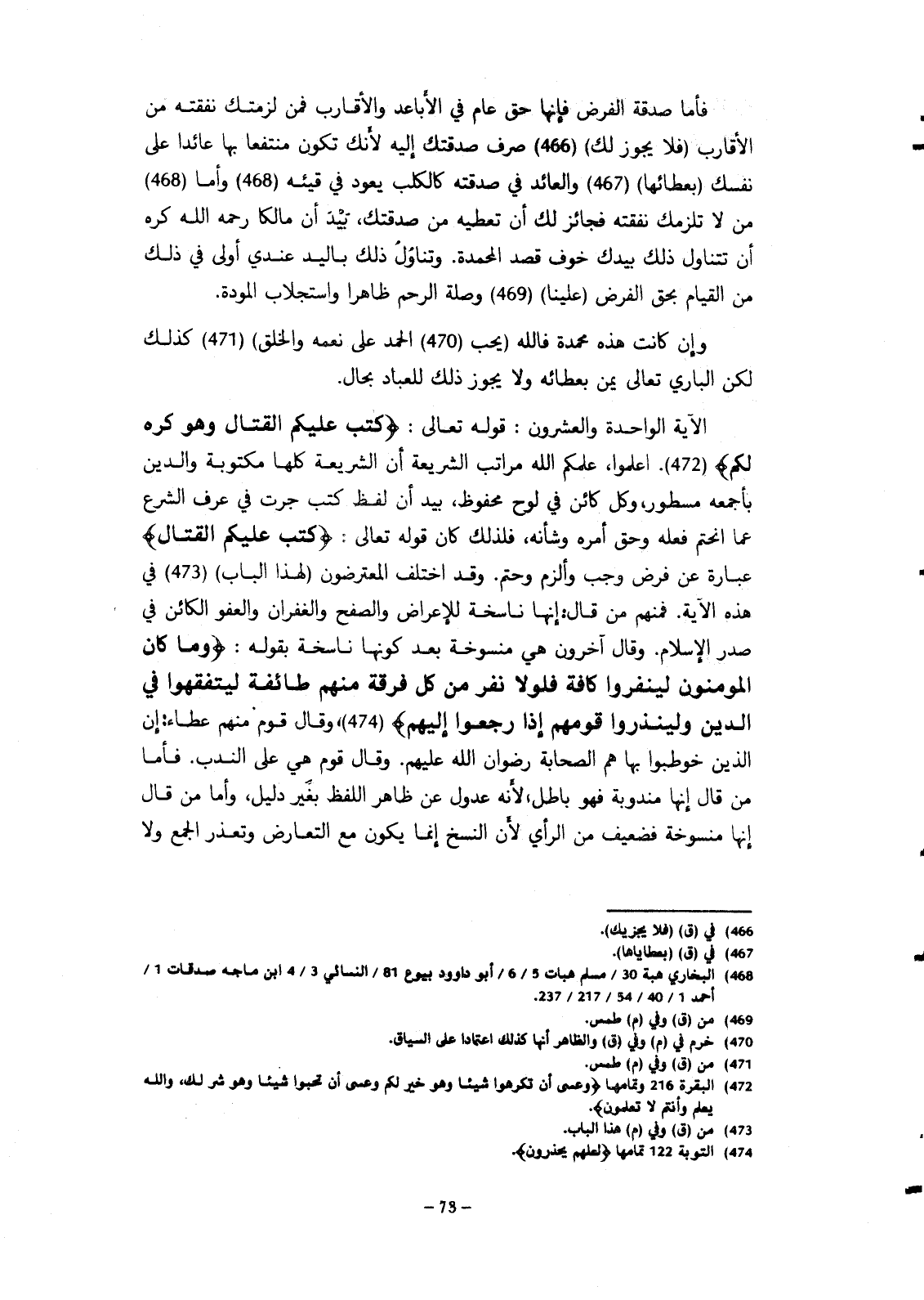 الآية الواحدة والعشرون: قوله تعالى: {كتب عليكم القتال وهو كره لكم} اعلموا، علمكم الله مراتب الشريعة أن الشريعة كلها مكتوبة والدين بأجمعه مسطور وكل كائن في لوح محفوظ، بيد أن لفظ كتب جرت في عرف الشرع عما انحتم فعله وحق أمره وشأنه، فلذلك كان قوله تعالى: {كتب عليكم القتال} عبارة عن فرض وجب وألزم وحتم. وقد اختلف المعترضون لهذا الباب في هذه الآية، فمنهم من قال: إنها ناسخة للإعراض والصفح والغفران والعفو الكائن في صدر الإسلام. وقال آخرون هي منسوخة بعد كونها ناسخة بقوله: {وما كان المؤمنون لينفروا كافة فلولا نفر من كل فرقة منهم طائفة ليتفقهوا في الدين ولينذروا قومهم إذا رجعوا إليهم} وقال قوم منهم عطاء إن الذين خوطبوا بها هم الصحابة رضوان الله عليهم، وقال قوم هي على الندب. فأما من قال إنها مندوبة فهو باطل لأنه عدول عن ظاهر اللفظ بغير دليل، وأما من قال إنها منسوخة فضعيف من الرأي لأن النسخ إنما يكون مع التعارض وتعذر الجمع ولا