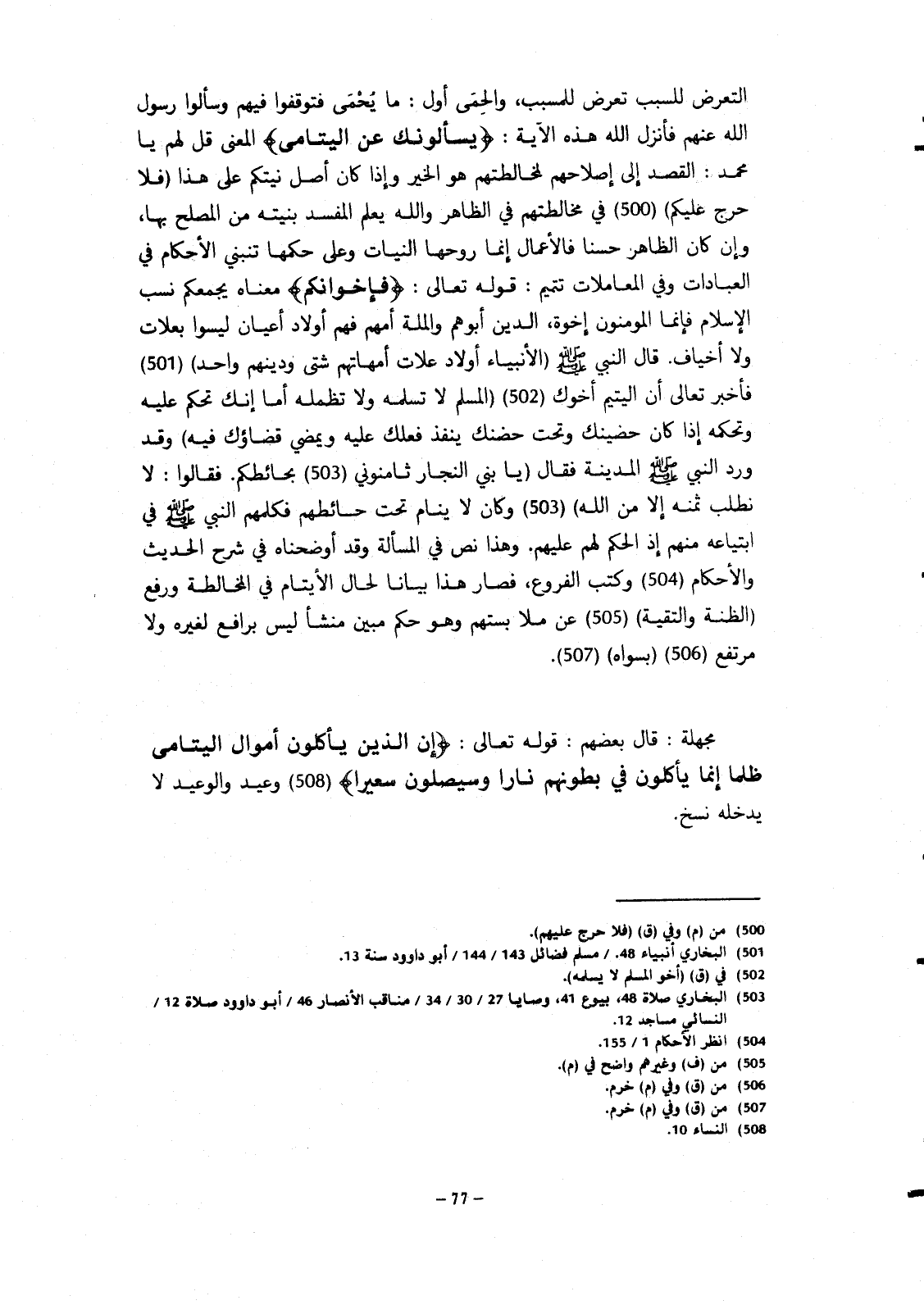 التعرض للسبب تعرض للمسبب، والحمي أول: ما يحمى فتوقفوا فيهم وسألوا رسول الله عنهم فأنزل الله هذه الآية: {يسألونك عن اليتامى} المعنى قل لهم يا محمد: القصد إلى إصلاحهم لمخالطتهم هو الخير وإذا كان أصل نيتكم على هذا فلا حرج عليكم. في مخالطتهم في الظاهر والله يعلم المفسد نيته من المصلح بها، وإن كان الظاهر حسنا فالأعمال إنما روحها النيات وعلى حكمها تنبني الأحكام في العبادات وفي المعاملات تتميم: قوله تعالى: {فإخوانكم} معناه يجمعكم نسب الإسلام فإنما المؤمنون إخوة، الدين أبوهم. والملة أمهم فهم أولاد أعيان ليسوا بعلات ولا أخياف. قال النبي صلى الله عليه وسلم الأنبياء أولاد علات أمهاتهم شتى ودينهم واحد. فأخبر تعالى أن اليتيم أخوك، المسلم لا تسلمه ولا تظلمه أما إنك تحكم عليه وتحكمه إذا كان حضينك وتحت حضنك ينفذ فعلك عليه ويمضى قضاؤك فيه، وقد ورد النبي صلى الله عليه وسلم المدينة فقال يا بني النجار ثامنوني بحائطم فقالو: لانطلب ثمنه إلا من الله، وكان لا ينام تحت حائطهم فكلمهم النبي صلى الله عليه وسلم في ابتياعه منهم إذ الحكم لهم عليهم. وهذا نص في المسألة وقد أوضحناه في شرح الحديث والأحكام، وكتب الفروع، فصار هذا بيانا لحال الأيتام في المخالطة ورفع الظنة والتقية، عن ملابستهم وهو حكم مبين منشأ ليس برافع لغيره ولا مرتفع بسواء.