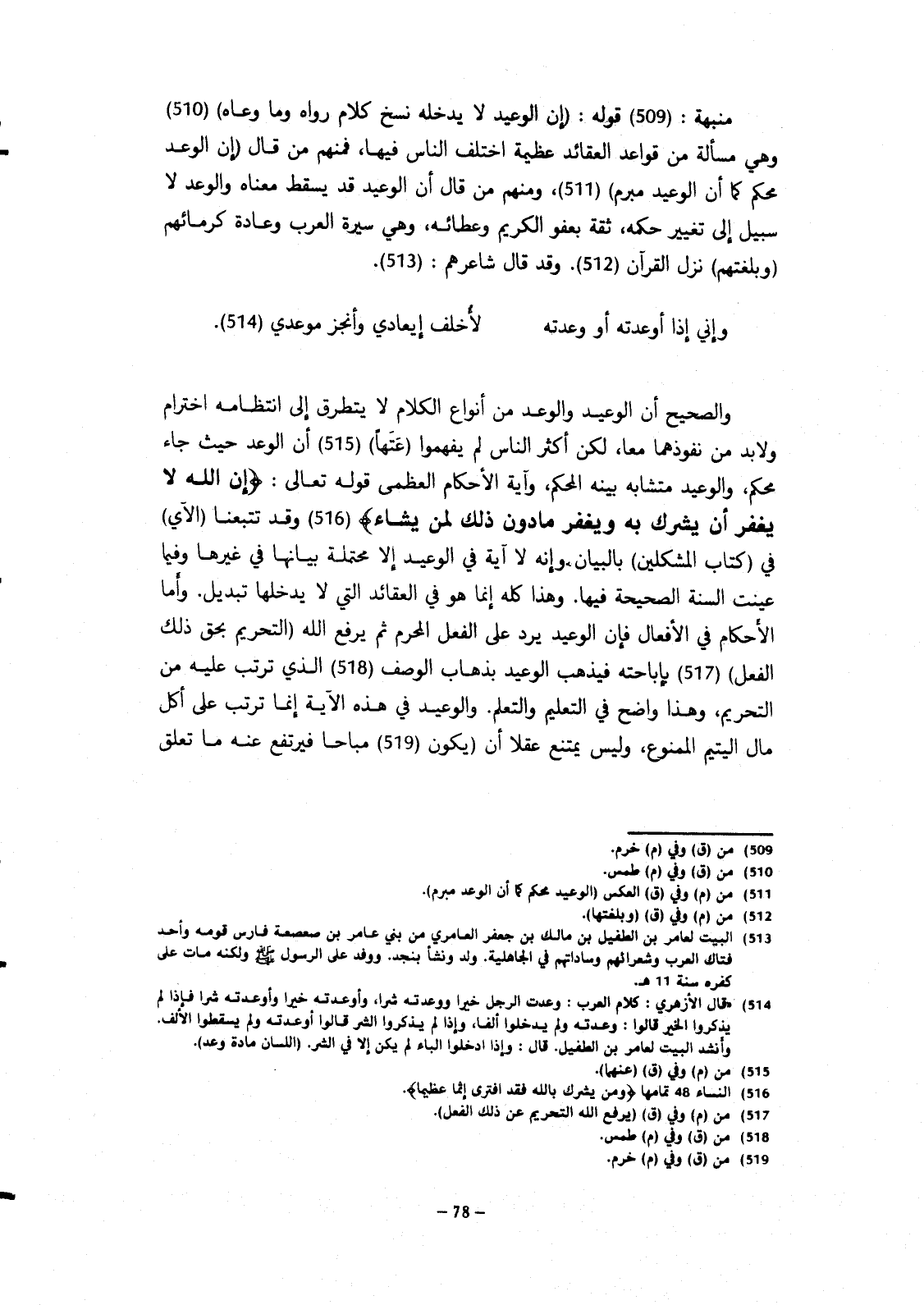 مبهة: قوله: (إن الوعيد لا يدخله نسخ كلام رواه وما وعاه) وهي مسألة من قواعد العقائد عظيمة اختلف الناس فيها، فمنهم من قال (إن الوعد محك كما أن الوعيد مبرم) ومنهم من قال إن الوعيد قد يسقط معناه والوعد لا سبيل إلى تغيير حكمه، ثقة بعفو الكريم وعطائه، وهي سيرة العرب وعادة كرمائهم وبلغتهم، نزل القرآن، وقد قال شاعرهم.