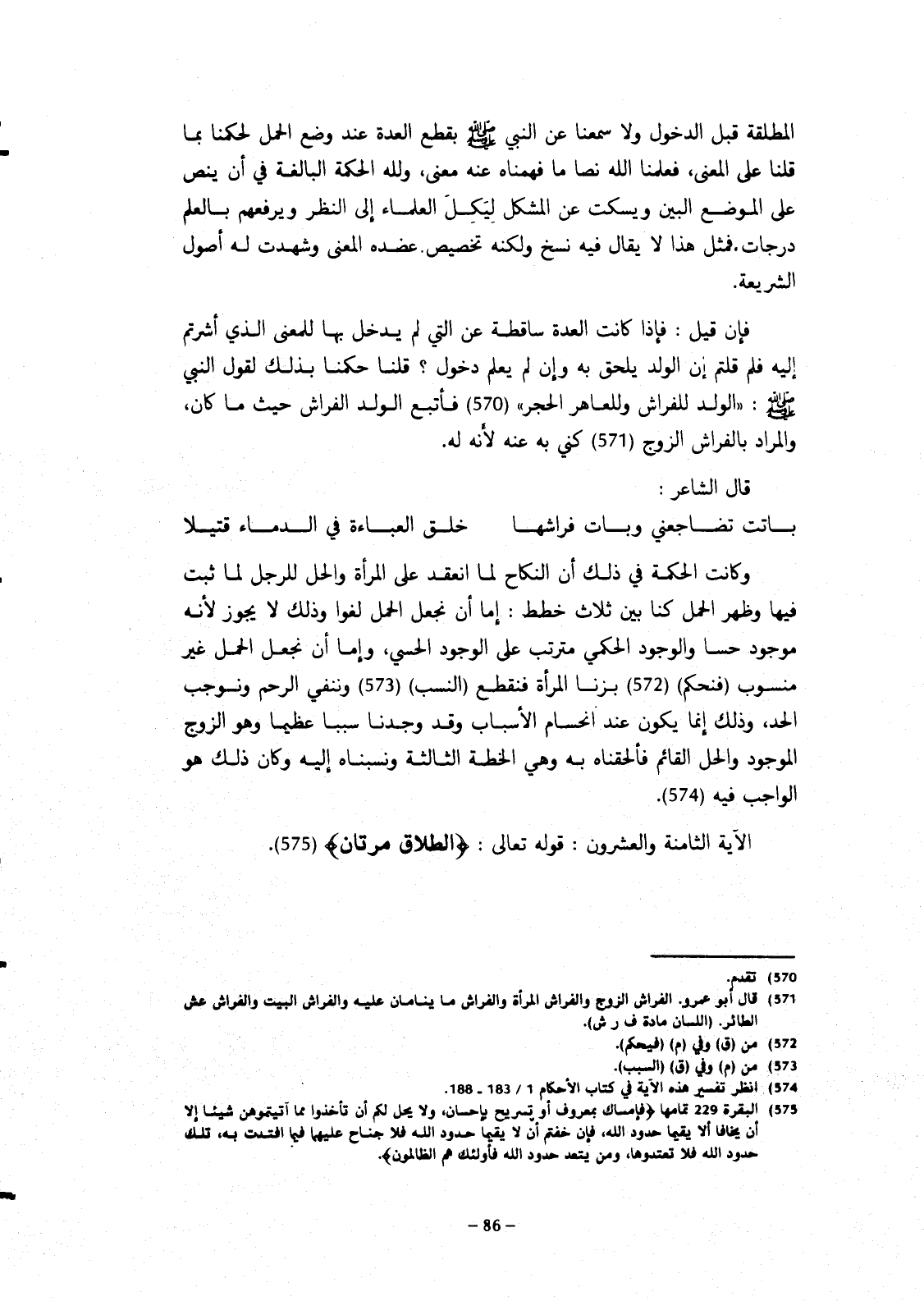 المطلقة قبل الدخول ولا سمعنا عن النبي صلى الله عليه وسلم بقطع العدة عند وضع الحمل لحكمنا بما قلنا على المعنى فعلمنا الله نصا ما فهمناه عنه معنى، ولله الحكمة البالغة في أن ينص على الموضع البين ويسكت عن المشكل ليكل العلماء إلى النظر ويرفعهم بالعلم درجات. فمثل هذا لا يقال فيه نسخ ولكنه تخصيص عضده المعنى وشهدت له أصول الشريعة.