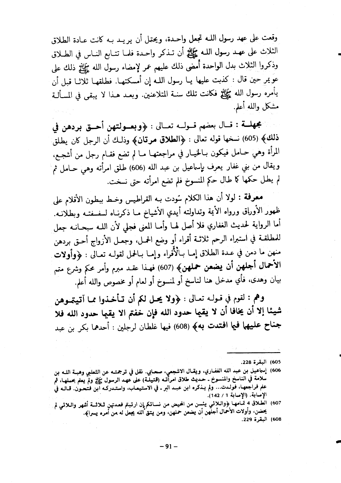 مجهلة: قال بعضهم قوله تعالى: {وبعولتهن أحق بردهن في ذلك} نسخها قوله تعالى: {الطلاق مرتان} وذلك أن الرجل كان يطلق المرأة وهي حالم فيكون بالخيار في مراجعتها ما لم تضع فقام رجل من أشجع ويقال من بني غفار، يعرف بإسماعيل بن عبد الله طلق امرأته وهي حامل ثم لم يطل حكمها كما طال حكم المنسوخ فلم تضع امرأته حتى نسخت.