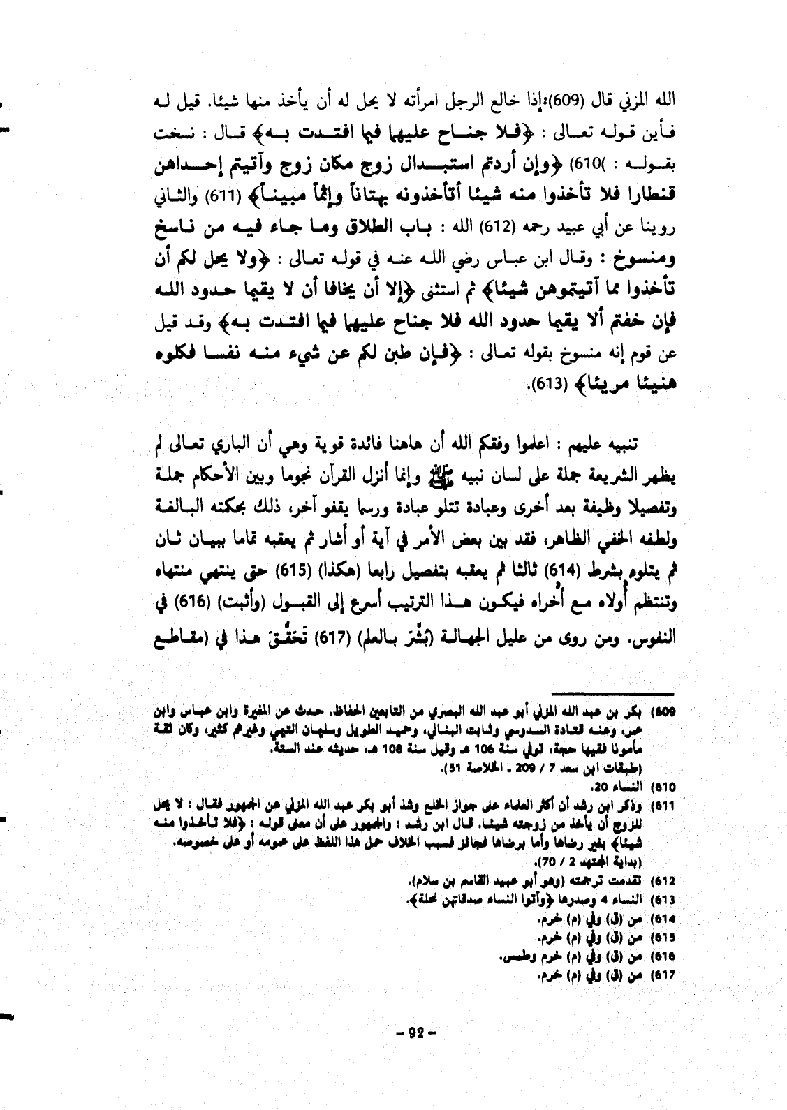 الله المزني، قال إذا خالع الرجل امرأته لا يحل له أن يأخذ منها شيئا قيل له فأين قوله تعالى: {فلا جناح عليهما فيما افتدت به} قال: نسخت بقوله: {وإن أردتم استبدال زوج مكان زوج وآتيتم إحداهن قنطارا فلا تأخذوا منه شيئا أتأخذونه بهتانا وإثما مبينا} والثاني روينا عن أبي عبيد رحمه الله: باب الطلاق وما جاء فيه من ناسخ ومنسوخ: وقال ابن عباس رضي الله عنه في قوله تعالى: {ولا يحل لكم أن تأخذوا مما آتيتموهن شيئا} ثم استثنى {إلا أن يخافا أن لا يقيما حدود الله فإن خفتم ألا يقيما حدود الله فلا جناح علهما فيما افتدت به} وقد قيل عن قوم إنه منسوخ بقوله تعالى: {فإن طبن لكم عن شيء منه نفسا فكلوه هنيئا مريئا}.