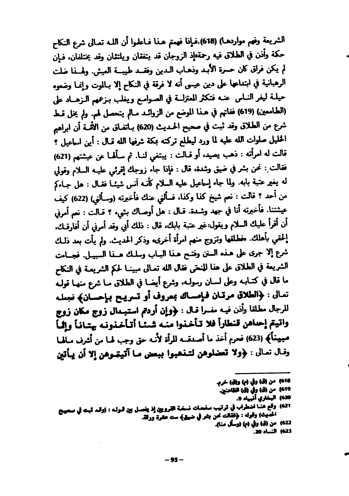 الشريعة وفهم مواردها. فإذا فهمتم هذا فاعلموا أن الله تعالى شرع النكاح حكمة وأذن في الطلاق فيه رحمة إذ الزوجان قد يتفقان ويلتئمان وقد يختلفان، فإن لم يكن فراق كان حسرة الأبد وذهاب الدين وفقد طيبة العيش. ولهذا ضلت الرهبانية في ابتداعها على دين عيسى أنه لا فرقة في النكاح إلا بالموت وإنما وضعوه حيلة ليفر الناس عنه فتكثر المعتزلة في الصوامع ويغلب بزعمهم الزهاد على الطامعين ففاتهم في هذا الموضع من الزوائد ما لم يتحصل لهم. ولم يخل قط شرع من الطلاق وقد ثبت في صحيح الحديث باتفاق من الأئمة أن إبراهيم الخليل صلوات الله عليه لما ورد ليطلع تركته بمكة شرفها الله قال: أين إسماعيل؟ قال له امرأته: ذهب يصيد، أو قالت: يبتغي لنا. ثم سألها عن عيشتهم فقالت: نحن بشر في ضيق وشدة، قال: فإذا جاء زوجك إقرئي عليه السلام وقولي له يغير عتبة بابه. ولما جاء إسماعيل عليه السلام كأنه آنس شيئا فقال: هل جاءكم من أحد؟ قالت: نعم شيخ كذا وكذا، فسألني عنك فأخبرته وسألني كيف عيشتنا. فأخبرته أنا في جهد وشدة. قال هل أوصاك بشيء؟ قالت: نعم أمرني أن أقرأ عليك السلام ويقول: غير عتبة بابك، قال: ذلك أبي وقد أمرني أن أفارقك، إلحقي بأهلك: فطلقها وتزوج منهم امرأة أخرى، وذكر الحديث ولم يأت بعد ذلك شرع إلا جرى على هذه السنن وفتح هذا الباب وسلك هذا السبيل. فجاءت الشريعة في الطلاق على هذا المنحى فقال الله تعالى مبينا لحكم الشريعة في النكاح ما قال في كتابه وعلى لسان رسوله، وشرع أيضا في الطلاق ما شرع منها قوله تعالى: {الطلاق مرتان فإمساك بمعروف أو تسريح بإحسان} فجعله للرجال، مطقا وأذن فيه مفسرا قال: {وإن أردتم استبدال زوج مكان زوج وأتيتم إحداهن قنطارا فلا تأخذوا منه شيئا أتأخذونه بهتانا وإثما مبينا} فحرم أخذ ما أصدقه المرأة لأنه حق وجب لها من أشرف ما لها وقال تعالى: {ولا تعضلوهن لتذهبوا ببعض ما آتيتموهن إلا أن يأتين