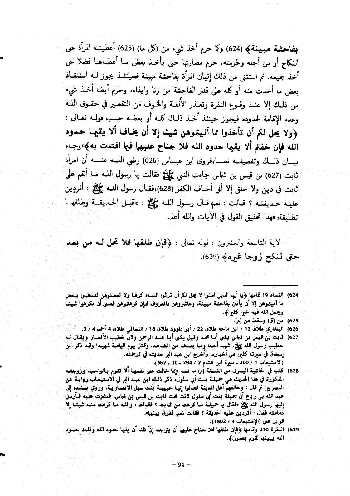 بفاحشة مبينة} وكما حرم أخذ شيء من كل ما أعطيته المرأة على النكاح أو من أجله وحرمته، حرم مضارتها حتى يأخذ بعض ما أعطاها فضلا عن أخذ جميعه. ثم استثنى من ذلك إتيان المرأة بفاحشة مبينة فحينئذ يجوز له استنقاذ بعض ما أخذت منه او كله على قدر الفاحشة من زنا وإيذاء، وحرم أيضا أخذ شيء من ذلك إلا عند وقوع النفرة وتعذر الألفة والخوف من التقصير في حقوق الله وعدم الإقامة لحدوده، فيجوز حينئذ أخذ ذلك كله أو بعضه حسب قوله تعالى: {ولا يحل لكم أن تأخذوا مما آتيتموهن شيئا إلا أن يخافا إلا يقيما حدود الله فإن خفتم ألا يقيما حدود الله فلا جناح عليهما فيما افتدت به} وجاء بيان ذلك وتفصيله نصا، فروى ابن عباس رضي الله عنه أن امرأة ثابت بن قيس بن شماس جاءت النبي صلى الله عليه وسلم فقالت يا رسول الله ما أنقم على ثابت في دين ولا خلق إلا أني أخاف الكفر، فقال رسول الله صلى الله عليه وسلم، أتردين عليه حديقته؟ قالت: نعم، قال رسول الله صلى الله عليه وسلم: اقبل الحديقة وطلقها تطليقة، فهذا تحقيق القول في الايات والله أعلم.
