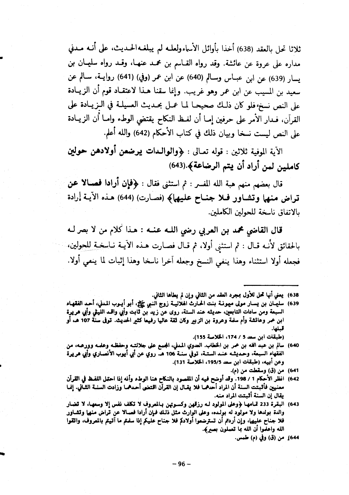 الآية الموفية ثلاثين: قوله تعالى: {والوالدات يرضعن أولادهن حولين كاملين لمن أراد أن يتم الرضاعة}. قال بعضهم منهم هبة الله المفسر، ثم استثنى فقال: {فإذا أرادا فصالا عن تراض منهما وتشاور فلا جناح عليهما} فصارت هذه الآية إرادة بالاتفاق ناسخة للحولين الكاملين.