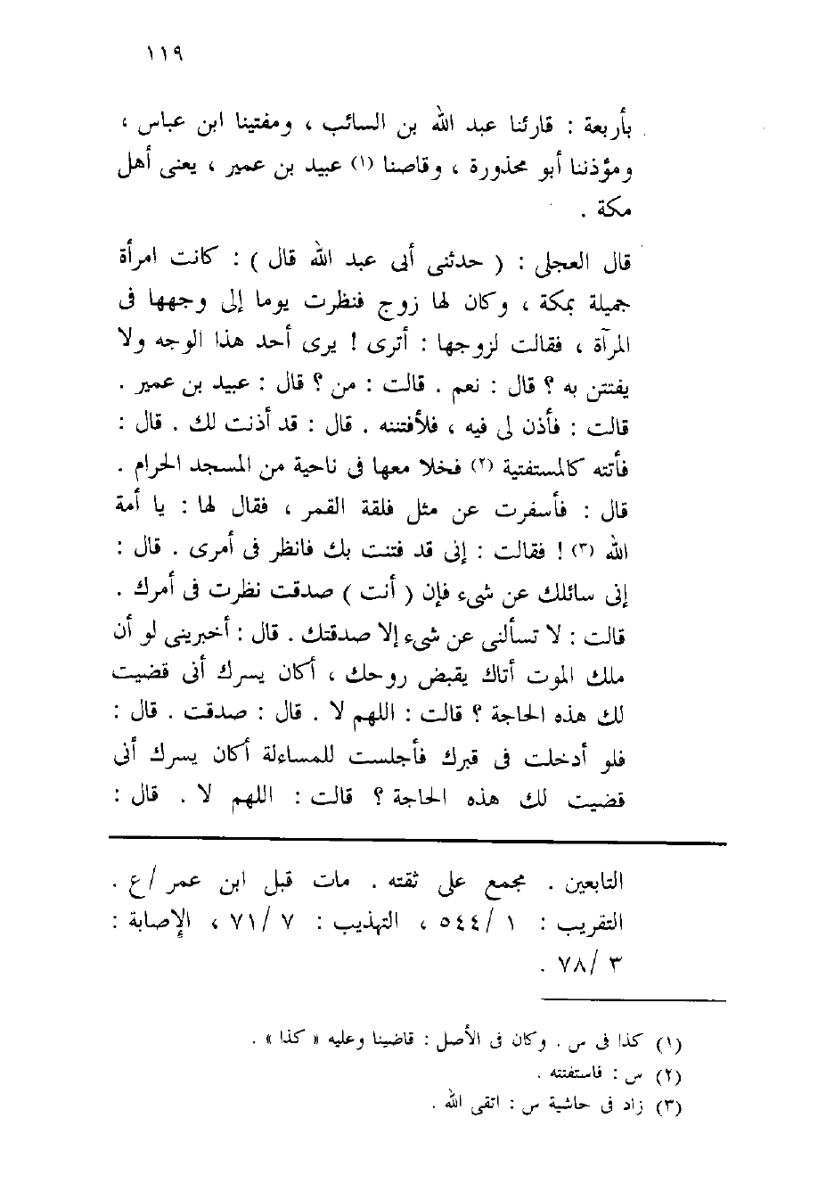 بأَرْبعَة قارئنا عبد الله بن السَّائِب ومفتينا بن عَبَّاس ومؤذننا أَبُو مَحْذُورَة وقاصنا عبيد بن عُمَيْر يعْنى أهل مَكَّة قَالَ الْعجلِيّ حَدثنِي أبي عبد الله قَالَ كَانَت امْرَأَة جميلَة بِمَكَّة وَكَانَ لَهَا زوج فَنَظَرت يَوْمًا إِلَى وَجههَا فِي الْمرْآة فَقَالَت لزَوجهَا أَتَرَى يرى أحد هَذَا الْوَجْه وَلَا يفتتن بِهِ قَالَ نعم قَالَت من قَالَ عبيد بن عُمَيْر قَالَت فَأذن لي فِيهِ فلأفتننه قَالَ قد أَذِنت لَك قَالَ فَاتَتْهُ كالمستفتية فَخَلا مَعهَا فِي نَاحيَة من الْمَسْجِد الْحَرَام قَالَ فأسفرت عَن مثل فلقَة الْقَمَر فَقَالَ لَهَا يَا امة الله فَقَالَت اني قد فتنت بك فَانْظُر فِي أَمْرِي قَالَ اني سَائِلك عَن شَيْء فان أَنْت صدقت نظرت فِي أَمرك قَالَت لَا تسالني عَن شَيْء الا صدقتك قَالَ اخبريني لَو ان ملك الْمَوْت اتاك يقبض روحك أَكَانَ يَسُرك اني قضيت لَك هَذِه الْحَاجة قَالَت اللَّهُمَّ لَا قَالَ