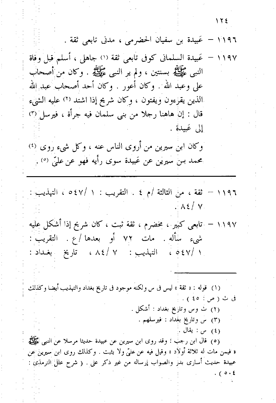 1197 - عُبَيْدَة السَّلمَانِي كوفى تَابِعِيّ ثِقَة جاهلى أسلم قبل وَفَاة النَّبِي صلى الله عَلَيْهِ وَسلم بِسنتَيْنِ وَلم ير النَّبِي صلى الله عَلَيْهِ وَسلم وَكَانَ من أَصْحَاب على وَعبد الله وَكَانَ أَعور وَكَانَ أحد أَصْحَاب عبد الله الَّذين يقرءُون ويفتون وَكَانَ شُرَيْح إِذا اشْتَدَّ عَلَيْهِ الشَّيْء قَالَ ان هَاهُنَا رجلا من بني سلمَان فِيهِ جرْأَة فَيُرْسل الى عُبَيْدَة وَكَانَ بن سِيرِين من أروى النَّاس عَنهُ وكل شَيْء روى مُحَمَّد بن سِيرِين عَن عُبَيْدَة سوى رَأْيه فَهُوَ عَن عَليّ ويروى عَن بن سِيرِين قَالَ مَا رَأَيْت رجلا كَانَ أَشد توقيا من عُبَيْدَة وكل شَيْء يرْوى إِبْرَاهِيم النَّخعِيّ عَن عُبَيْدَة سوى رَأْيه فَهُوَ عَن عبد الله إِلَّا حَدِيثا وَاحِدًا حَدثنَا أَبُو مُسلم عَن أَبِيه احْمَد بن عبد الله حَدثنَا مُوسَى بن أَيُّوب ثَنَا مخلد عَن هِشَام عَن مُحَمَّد ان عُبَيْدَة صلى قبل وَفَاة النَّبِي صلى الله عَلَيْهِ وَسلم بِسنتَيْنِ غير انه لم يكن يعد لَهُ صُحْبَة وَكَانَ يعرف فَضله