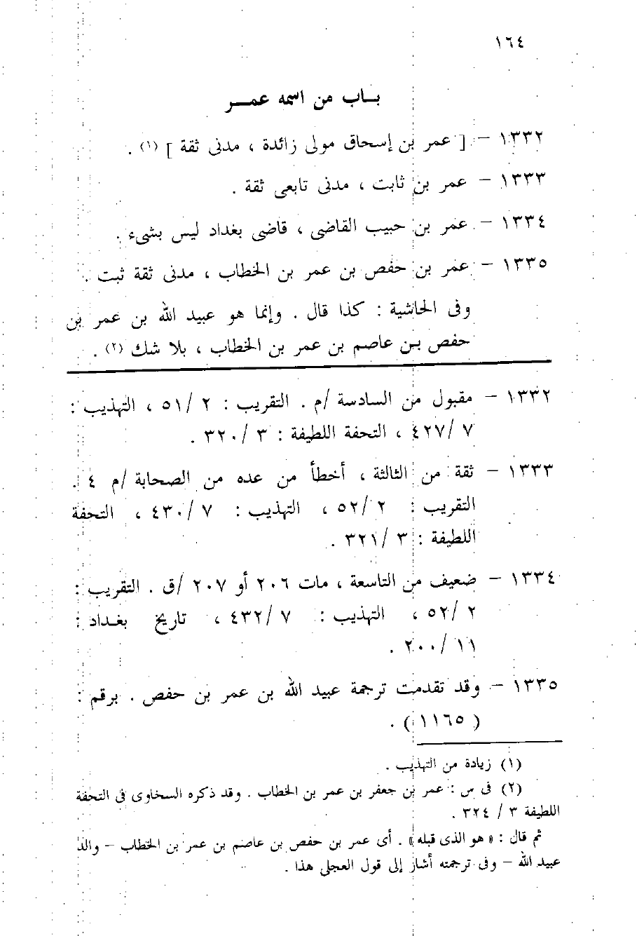 1335 - عمر بن حَفْص بن عمر بن الْخطاب مدنِي ثِقَة ثَبت وفى الْحَاشِيَة كَذَا قَالَ وَإِنَّمَا هُوَ عبيد الله بن عمر بن حَفْص بن عَاصِم بن عمر بن الْخطاب بِلَا شكّ