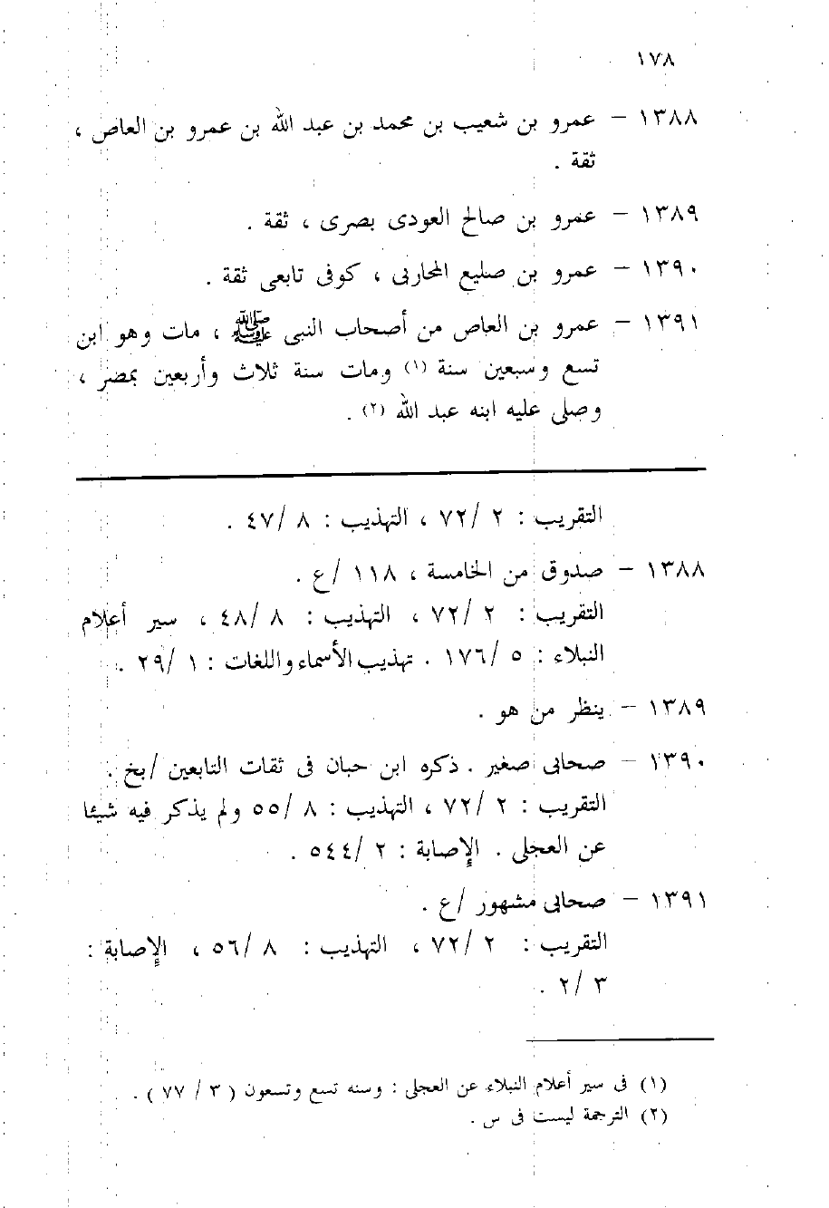 1391 - عَمْرو بن الْعَاصِ من أَصْحَاب النَّبِي صلى الله عَلَيْهِ وَسلم مَاتَ وَهُوَ بن تسع وَسبعين سنة وَمَات سنة ثَلَاث وَأَرْبَعين بِمصْر وَصلى عَلَيْهِ ابْنه عبد الله