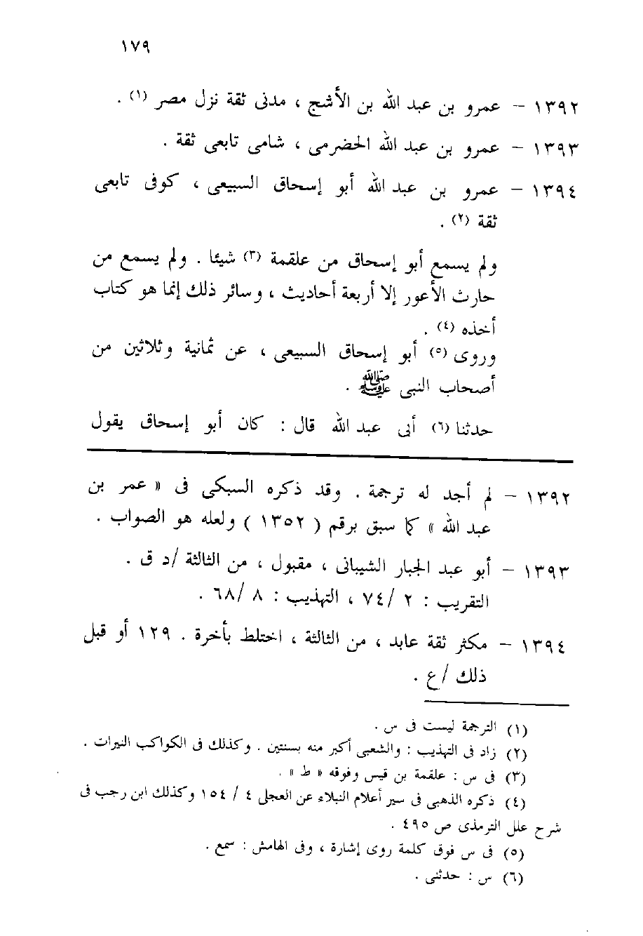 1394 - عَمْرو بن عبد الله أَبُو إِسْحَاق السبيعِي كوفى تَابِعِيّ ثِقَة وَلم يسمع أَبُو إِسْحَاق من عَلْقَمَة شَيْئا وَلم يسمع من حَارِث الْأَعْوَر إِلَّا أَرْبَعَة وَسَائِر ذَلِك إِنَّمَا هُوَ كتاب أَخذه وروى أَبُو إِسْحَاق السبيعِي عَن ثَمَانِيَة وَثَلَاثِينَ من أَصْحَاب النَّبِي صلى الله عَلَيْهِ وَسلم حَدثنَا أبي عبد الله قَالَ كَانَ أَبُو إِسْحَاق يَقُول لإسرائيل الزم هَؤُلَاءِ الثَّلَاثَة فَإِنَّهُم أَصْحَاب علم وفصاحة عبد الْملك بن عُمَيْر وَالْأَعْمَش وَسماك بن حَرْب حَدثنَا أَبُو مُسلم عَن أَبِيه أَحْمد عَن جده عبد الله قَالَ كَانَ أَبُو إِسْحَاق السبيعِي يحرض الشَّبَاب يَقُول مَا أَسْتَطِيع ان أستوى قَائِما حَتَّى أعْتَمد على رجلَيْنِ فَإِذا اعتدلت قَائِما قَرَأت بِأَلف آيَة وَأَبُو إِسْحَاق أكبر من عبد الْملك بن عُمَيْر بِسنتَيْنِ
