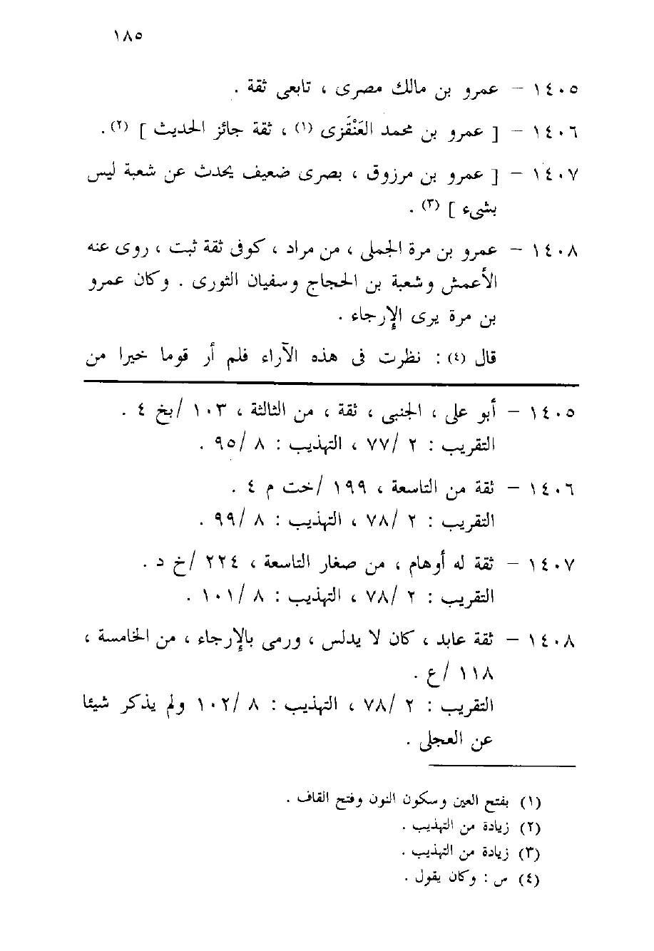 1408 - عَمْرو بن مرّة الْجملِي من مُرَاد كوفى ثِقَة ثَبت روى عَنهُ الْأَعْمَش وَشعْبَة بن الْحجَّاج وسُفْيَان الثَّوْريّ وَكَانَ عَمْرو بن مرّة يرى الإرجاء قَالَ نظرت فِي هَذِه الآراء فَلم أر قوما خيرا من المرجئة فَأَنا مرجىء فَقَالَ لَهُ سُلَيْمَان الْأَعْمَش لم تسم باسم غير الْإِسْلَام قَالَ أَنا كَذَلِك وَلم يكن أحد أروى عَن عبد الله بن سَلمَة مِنْهُ وَعبد الله بن سَلمَة يكنى أَبَا الْعَالِيَة سمع مِنْهُ بعد مَا كبر