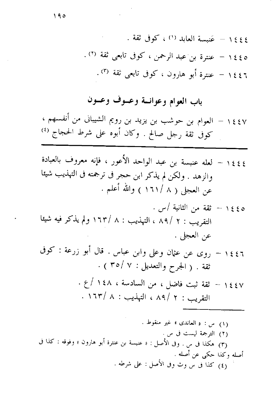 1447 - الْعَوام بن حَوْشَب بن يزِيد بن رُوَيْم الشَّيْبَانِيّ من أنفسهم كوفى ثِقَة رجل صَالح وَكَانَ أَبوهُ على شَرط الْحجَّاج وَكَانَ رجل سوء وَكَانَ الْعَوام صَاحب سنة ثَبت صَالح وَكَانَ أَخُوهُ خرَاش على شرطة يُوسُف بن عمر وروى نَحوا من مِائَتي حَدِيث أَو أَكثر قَلِيلا وروى عَن النَّخعِيّ والتيمى وروى عَنهُ يزِيد بن هَارُون وهشيم وَالنَّاس