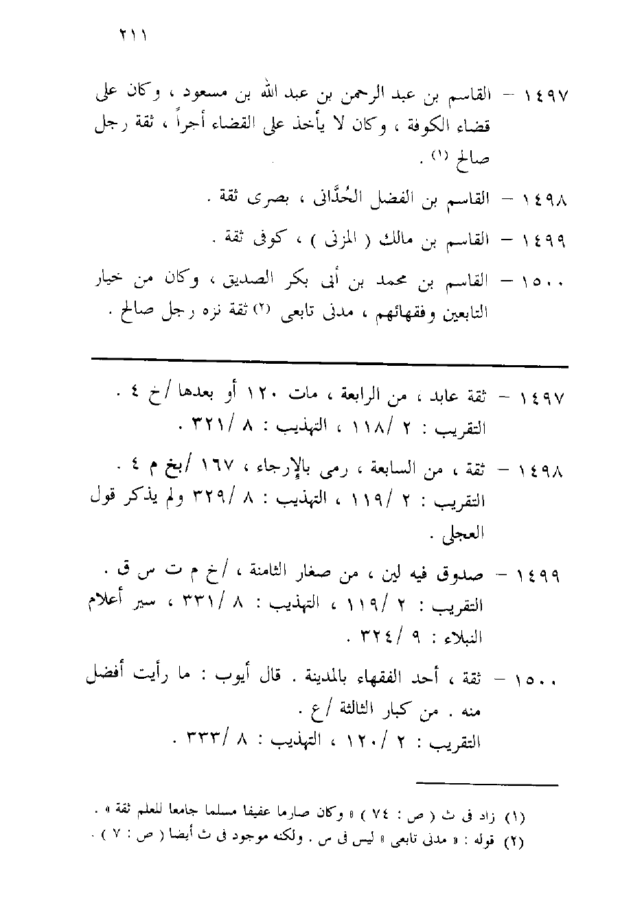 1497 - الْقَاسِم بن عبد الرَّحْمَن بن عبد الله بن مَسْعُود وَكَانَ على قَضَاء الْكُوفَة وَكَانَ لَا يَأْخُذ على الْقَضَاء أجرا ثِقَة رجل صَالح