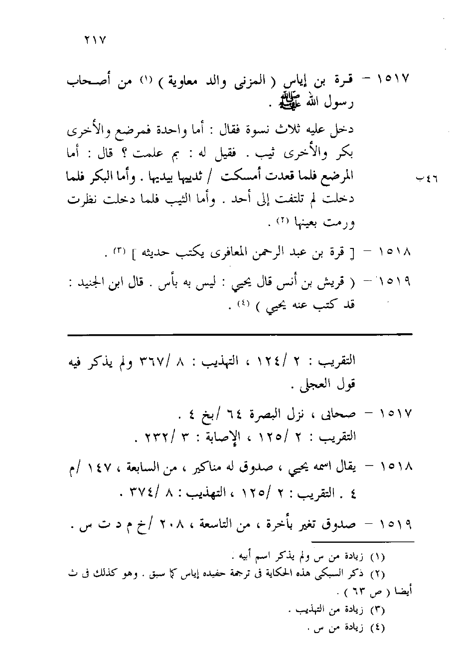 1517 - قُرَّة بن إِيَاس الْمُزنِيّ وَالِد مُعَاوِيَة من أَصْحَاب رَسُول الله صلى الله عَلَيْهِ وَسلم دخل عَلَيْهِ ثَلَاث نسْوَة فَقَالَ أما وَاحِدَة فمرضع وَالْأُخْرَى بكر وَالْأُخْرَى ثيب فَقيل لَهُ بِمَ علمت قَالَ أما الْمُرْضع فَلَمَّا قعدت أَمْسَكت ثدييها بِيَدَيْهَا وَأما الْبكر فَلَمَّا دخلت لم تلْتَفت إِلَى أحد وَأما الثّيّب فَلَمَّا دخلت نظرت ورمت بِعَينهَا