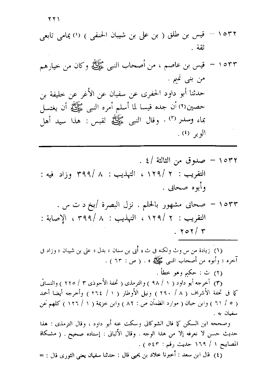 1533 - قيس بن عَاصِم من أَصْحَاب النَّبِي صلى الله عَلَيْهِ وَسلم وَكَانَ من خيارهم من بنى تَمِيم حَدثنَا أَبُو دَاوُد الْحَفرِي عَن سُفْيَان عَن الْأَغَر عَن خَليفَة بن حُصَيْن أَن جده قيسا لما أسلم أمره النَّبِي صلى الله عَلَيْهِ وَسلم أَن يغْتَسل بِمَاء وَسدر وَقَالَ النَّبِي صلى الله عَلَيْهِ وَسلم لقيس هَذَا سيد أهل الْوَبر