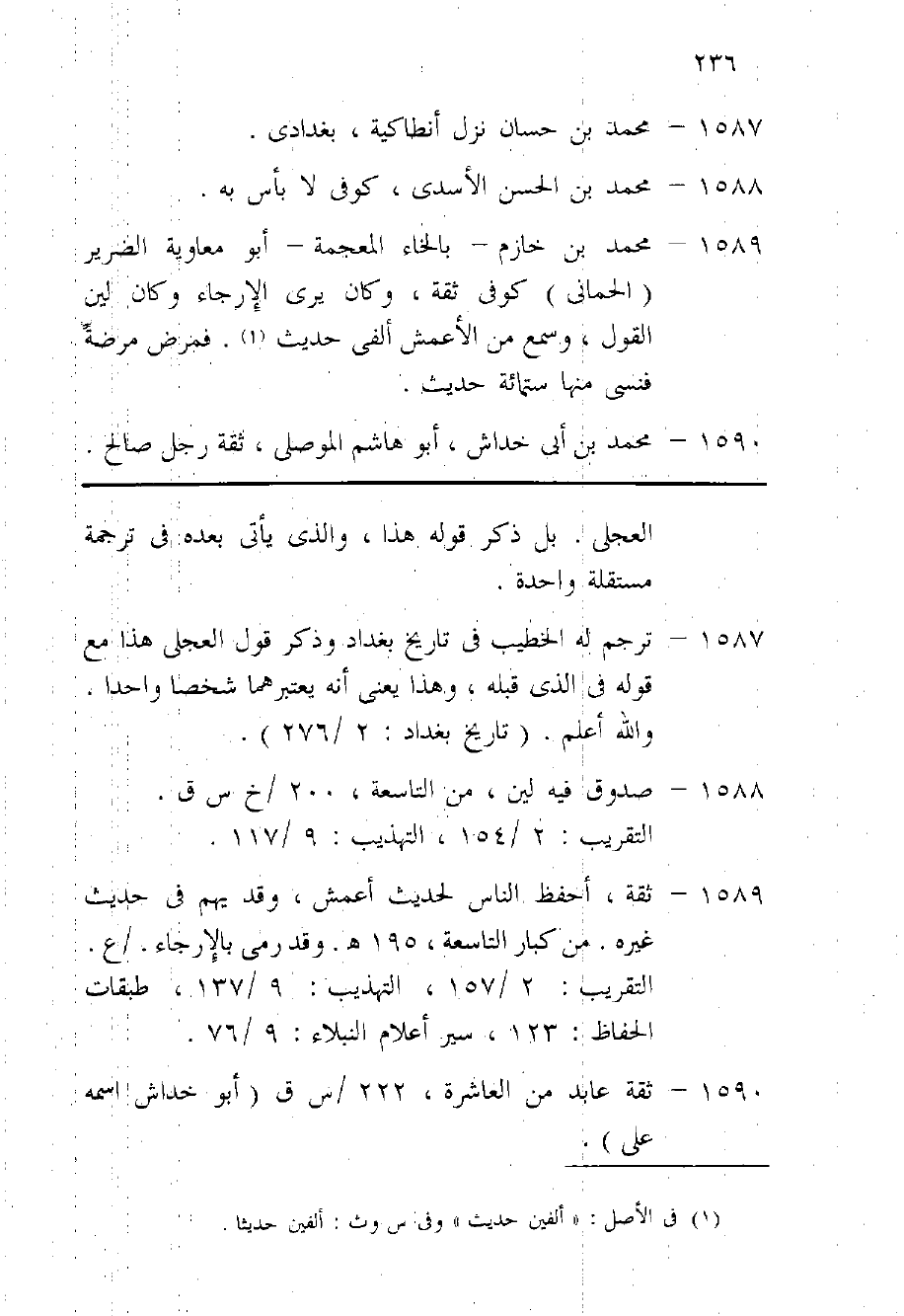 1590 - مُحَمَّد بن أبي خِدَاش أَبُو هَاشم الْموصِلِي ثِقَة رجل صَالح وكل شَيْء يرْوى عَن أبي هَاشم حديثان حَدِيث أبي هُرَيْرَة فِي الصَّلَاة الْوُسْطَى وَحَدِيثه حَيْثُ دخل على مُعَاوِيَة يعودهُ