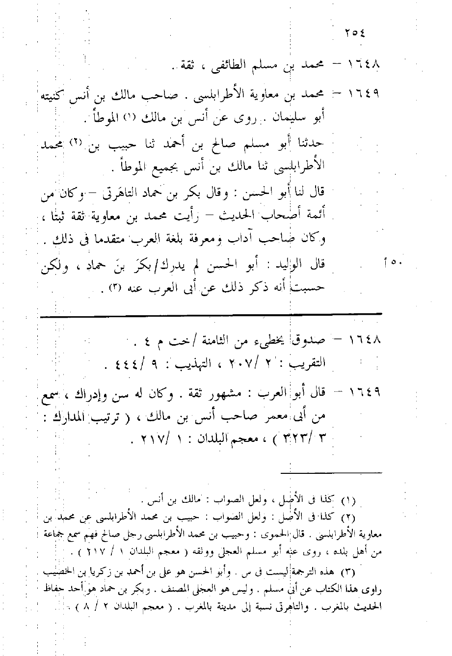 1649 - مُحَمَّد بن مُعَاوِيَة الأطرابلسي صَاحب مَالك بن أنس كنيته أَبُو سُلَيْمَان روى عَن أنس بن مَالك الْمُوَطَّأ حَدثنَا أَبُو مُسلم صَالح بن أَحْمد ثَنَا حبيب بن مُحَمَّد الأطرابلسى ثَنَا مَالك بن أنس بِجَمِيعِ الْمُوَطَّأ قَالَ لنا أَبُو الْحسن وَقَالَ بكر بن حَمَّاد التاهرتي وَكَانَ من أَئِمَّة أَصْحَاب الحَدِيث رَأَيْت مُحَمَّد بن مُعَاوِيَة ثِقَة ثبتا وَكَانَ صَاحب آدَاب وَمَعْرِفَة بلغَة الْعَرَب مُتَقَدما فِي ذَلِك قَالَ الْوَلِيد أَبُو الْحسن لم يدْرك بكر بن حَمَّاد وَلَكِن حسبت أَنه ذكر ذَلِك عَن أبي الْعَرَب عَنهُ