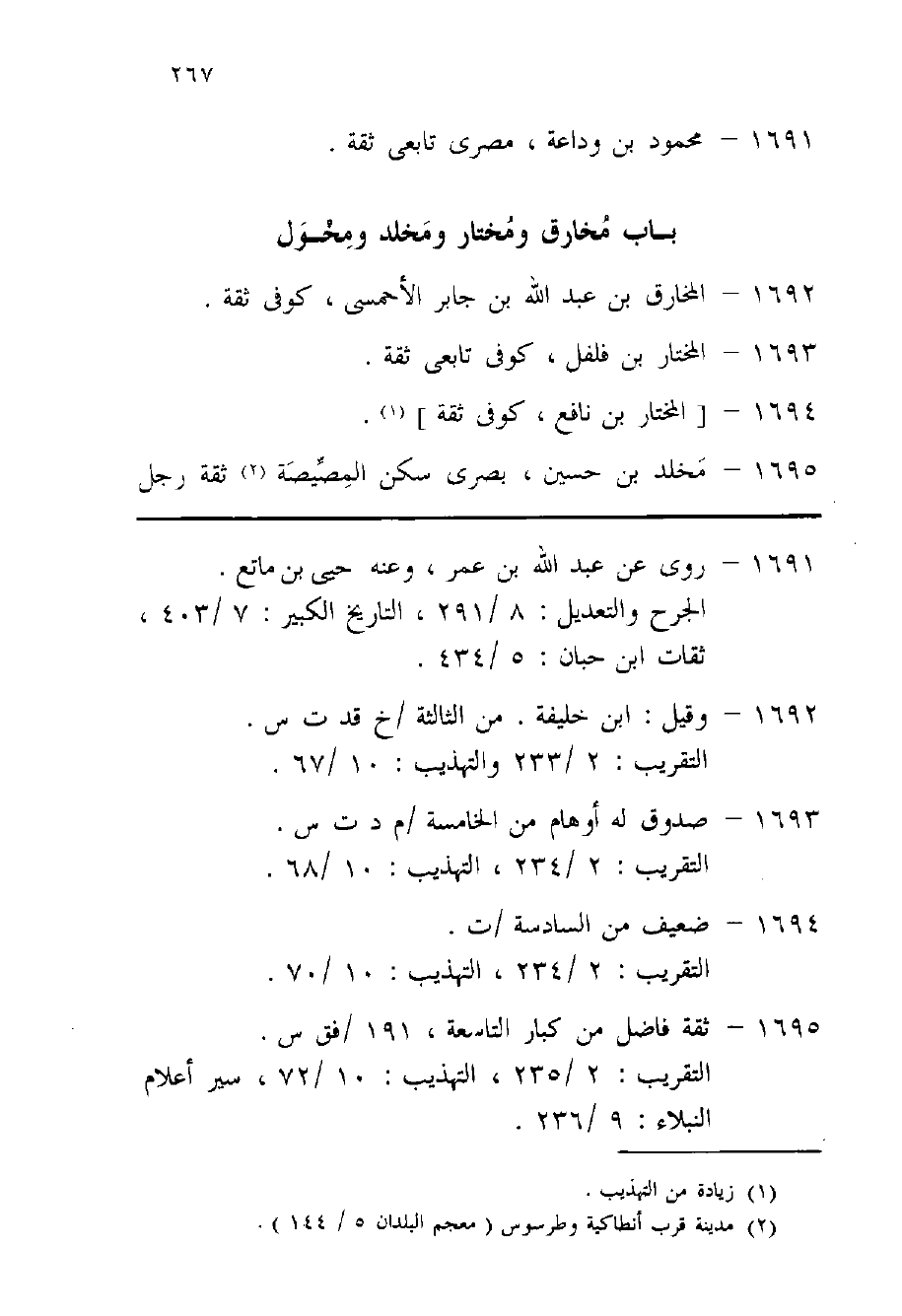 1695 - مخلد بن حُسَيْن بصرى سكن المصيصة ثِقَة رجل صَالح وَكَانَ من عقلاء الرِّجَال وَكَانَت أمه تَحت هِشَام بن حسان فَقَالَ لَهُ هَارُون مَا قرَابَة مَا بَيْنك وَبَين هِشَام بن حسان فَقَالَ هُوَ أَبُو إخوتى