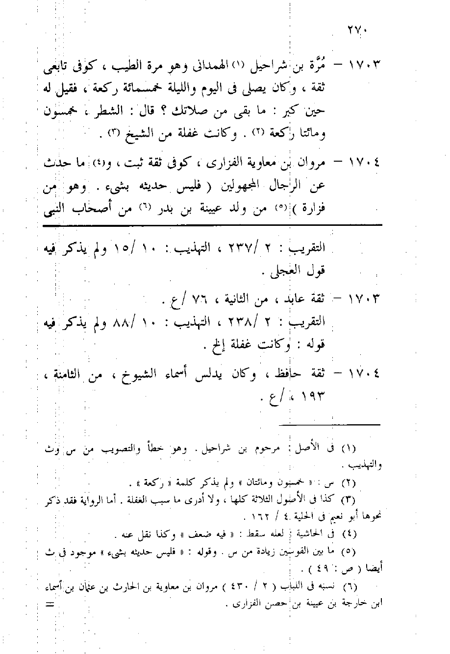1703 - مرّة بن شرَاحِيل الْهَمدَانِي وَهُوَ مرّة الطّيب كوفى تَابِعِيّ ثِقَة وَكَانَ يصلى فِي الْيَوْم وَاللَّيْلَة خَمْسمِائَة رَكْعَة فَقيل لَهُ حِين كبر مَا بقى من صَلَاتك قَالَ الشّطْر خَمْسُونَ وَمِائَتَا رَكْعَة وَكَانَت غَفلَة من الشَّيْخ