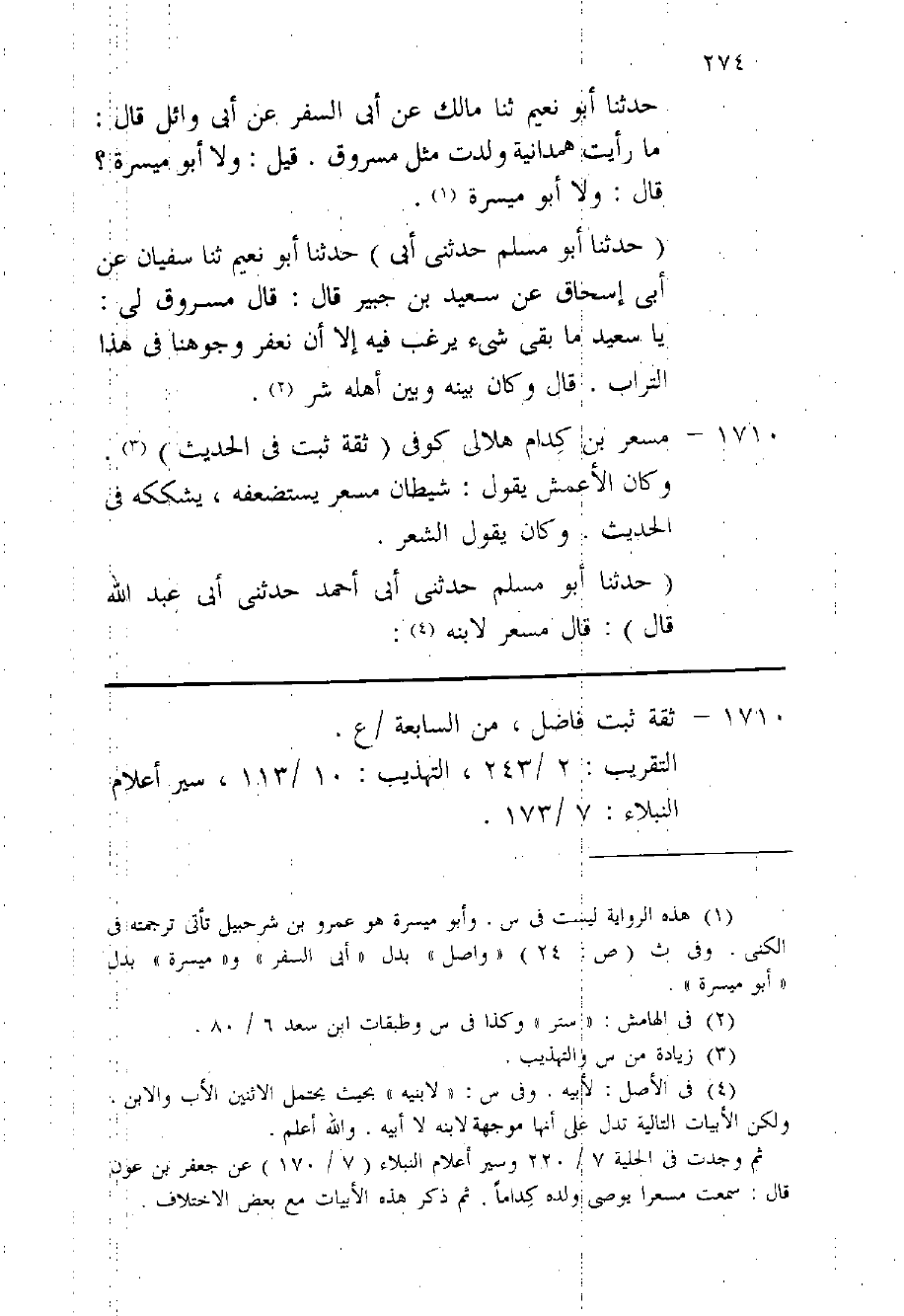 1710 - مسعر بن كدام هلالي كُوفِي ثِقَة ثَبت فِي الحَدِيث وَكَانَ الْأَعْمَش يَقُول شَيْطَان مسعر يستضعفه يشككه فِي الحَدِيث وَكَانَ يَقُول الشّعْر حَدثنَا أَبُو مُسلم حَدثنِي أبي أَحْمد حَدثنِي أبي عبد الله قَالَ قَالَ مسعر لِابْنِهِ إِنِّي نحلتك يَا كدام مودتى فاسمع لقَوْل أَب عَلَيْك شفيق أما المزاحة والمراء فدعهما خلقان لَا أرضاهما لصديق إِنِّي بلوتهما فَلم احمدهما لمجاور جاورته ورفيق قَالَ وَقَالَ عبد الله بن الْمُبَارك أَلا اقْتَدَيْتُمْ بسفيان ومسعركم وبابن مغول إِذْ يجهدهم الْوَرع قَالَ الْعجلِيّ كلما جَاءَ عَن الثَّوْريّ عَن أبي سَلمَة فَهُوَ مسعر بن كدام