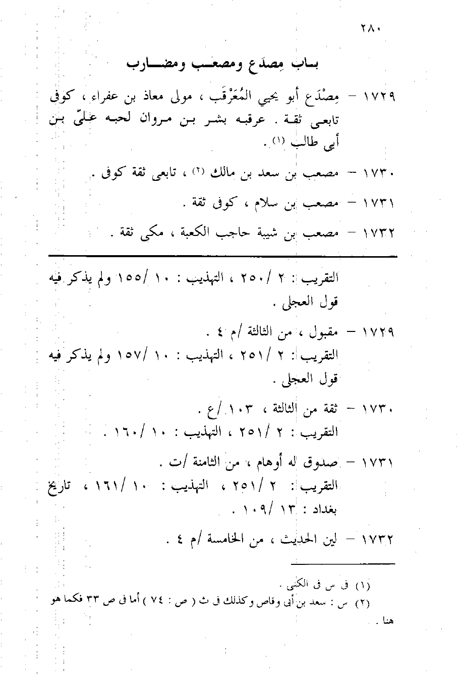 1729 - مصدع أَبُو يحيى المعرقب مولى معَاذ بن عفراء كوفى تَابِعِيّ ثِقَة عرقبه بشر بن مَرْوَان لحبه على بن أَبى طَالب