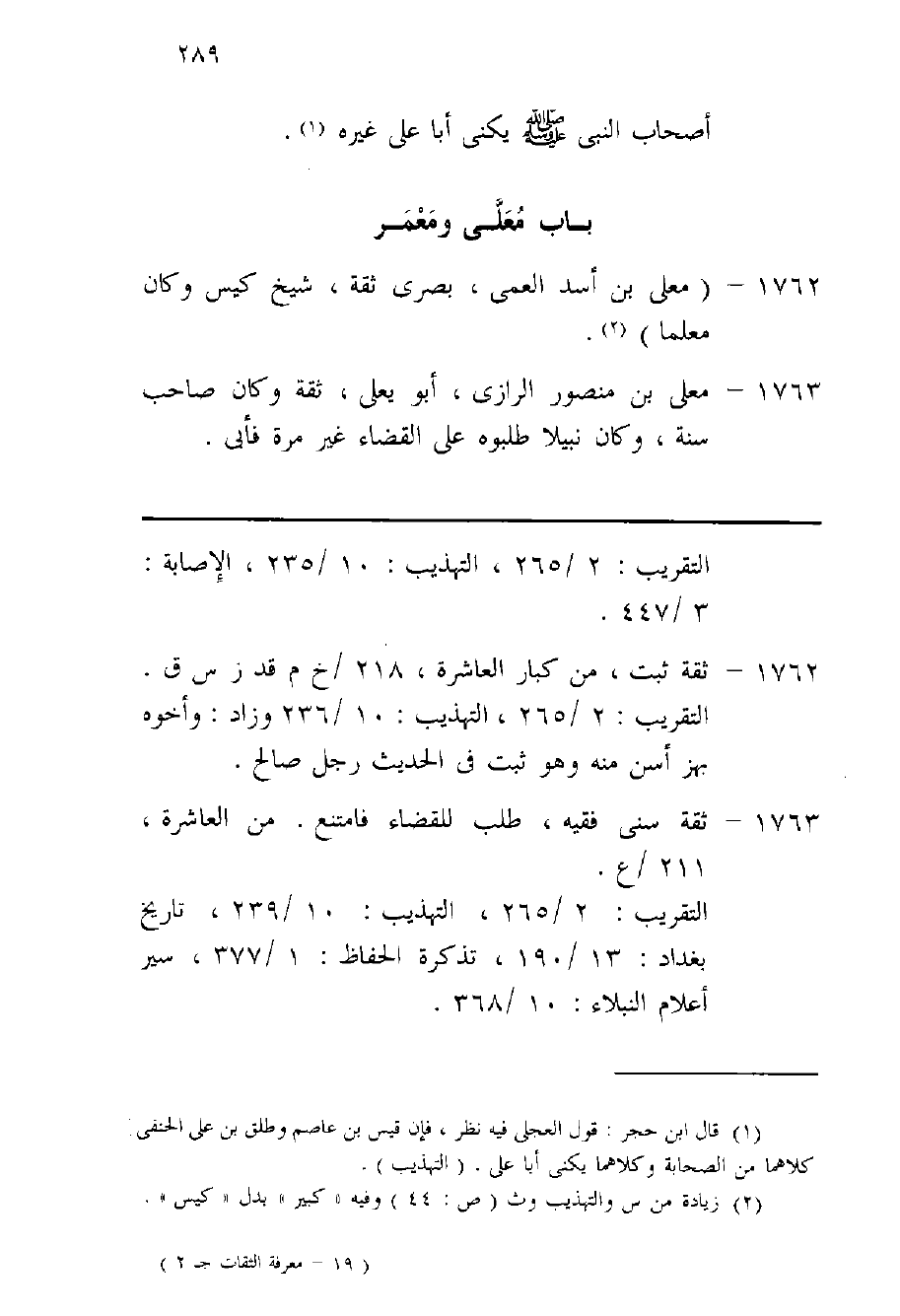 1763 - مُعلى بن مَنْصُور الرَّازِيّ أَبُو يعلى ثِقَة وَكَانَ صَاحب سنة وَكَانَ نبيلا طلبوه على الْقَضَاء غير مرّة فَأبى
