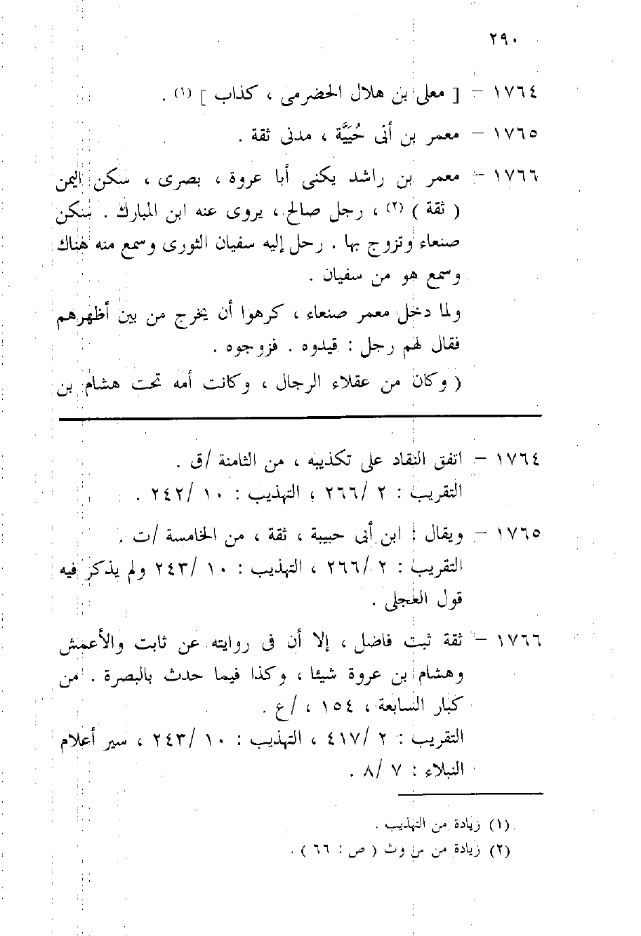 1766 - معمر بن رَاشد يكنى أَبَا عُرْوَة بصرى سكن الْيمن ثِقَة رجل صَالح يرْوى عَنهُ بن الْمُبَارك سكن صنعاء وَتزَوج بهَا رَحل إِلَيْهِ سُفْيَان الثَّوْريّ وَسمع مِنْهُ هُنَاكَ وَسمع هُوَ من سُفْيَان وَلما دخل معمر صنعاء كَرهُوا ان يخرج من بَين اظهرهم فَقَالَ لَهُ رجل قيدوه فَزَوجُوهُ وَكَانَ من عقلاء الرِّجَال وَكَانَت أمه تَحت هِشَام بن حسان فَقَالَ لَهُ هَارُون مَا قرَابَة مَا بَيْنك وَبَين هِشَام قَالَ هُوَ أَبُو إخوتى حَدثنَا أَبُو مُسلم حَدثنِي أبي قَالَ قَالَ بن الْمُبَارك قَالَ لي يحيى بن سعيد اكْتُبْ لي حَدِيث الْإِفْك حَدِيث الزهرى عَمَّن كتبته قَالَ قلت هُوَ عِنْدِي عَن يُونُس سَماع وَعَن معمر عرض قَالَ اكْتُبْ لي عَن معمر