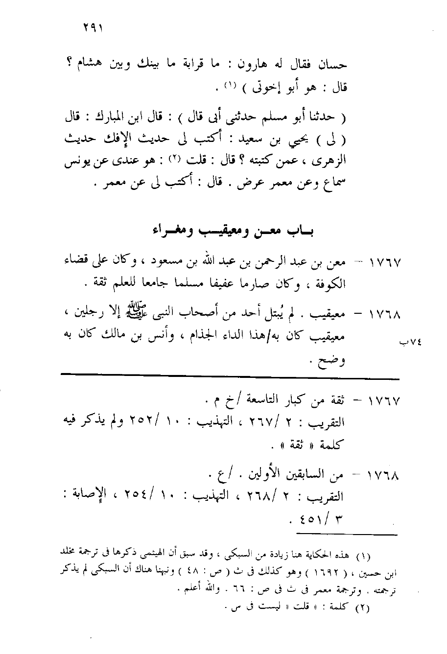 1767 - معن بن عبد الرَّحْمَن بن عبد الله بن مَسْعُود وَكَانَ على قَضَاء الْكُوفَة وَكَانَ صَارِمًا عفيفا مُسلما جَامعا للْعلم ثِقَة