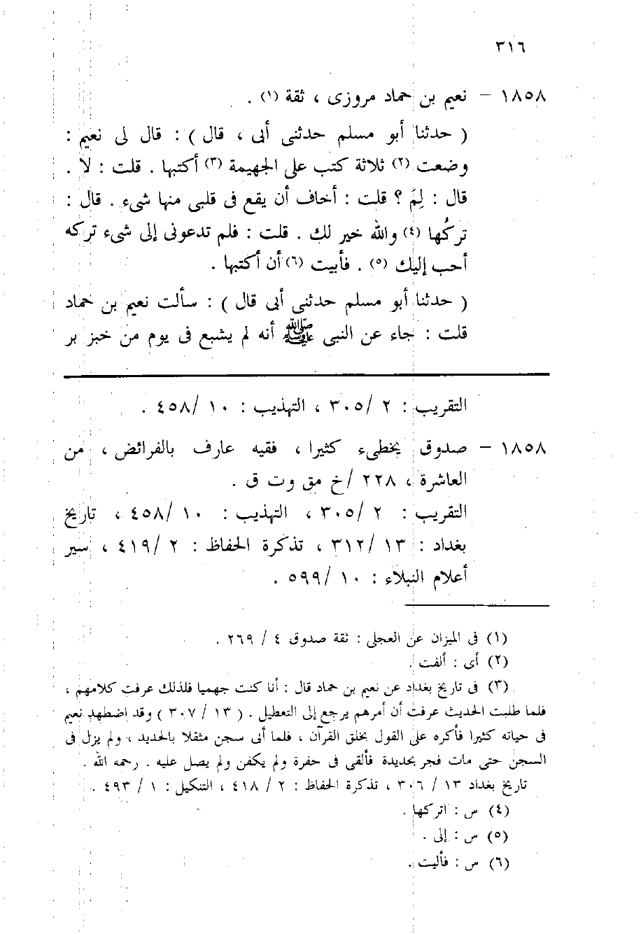 1858 - نعيم بن حَمَّاد مروزي ثِقَة حَدثنَا أَبُو مُسلم حَدثنِي أبي قَالَ قَالَ لي نعيم وضعت ثَلَاثَة كتب على الجهيمة اُكْتُبْهَا قلت لَا قَالَ لم قلت أَخَاف أَن يَقع فِي قلبِي مِنْهَا شَيْء قَالَ تَركهَا وَالله خير لَك قلت فَلم تدعونى إِلَى شَيْء تَركه أحب إِلَيْك فأبيت ان اُكْتُبْهَا حَدثنَا أَبُو مُسلم حَدثنِي أبي قَالَ سَأَلت نعيم بن حَمَّاد قلت جَاءَ عَن النَّبِي صلى الله عَلَيْهِ وَسلم انه لم يشْبع فِي يَوْم من خبز بر مرَّتَيْنِ وَجَاء أَنه كَانَ يعد لأَهله قوت سنة فَكيف هَذَا قَالَ كَانَ يعد لأَهله قوت سنة فتنزل بِهِ النَّازِلَة فيقسمه فَيبقى بِلَا شَيْء صلى الله عَلَيْهِ وَسلم حَدثنَا أَبُو مُسلم حَدثنِي أبي قَالَ وَسَأَلت نعيما قلت يَسُرك أَنَّك شهِدت صفّين قَالَ لَا قلت فَقَالُوا لَك لابد أَن تكون مَعَ أحد الْفَرِيقَيْنِ قَالَ فان كَانَ لَا بُد فَمَعَ عَليّ