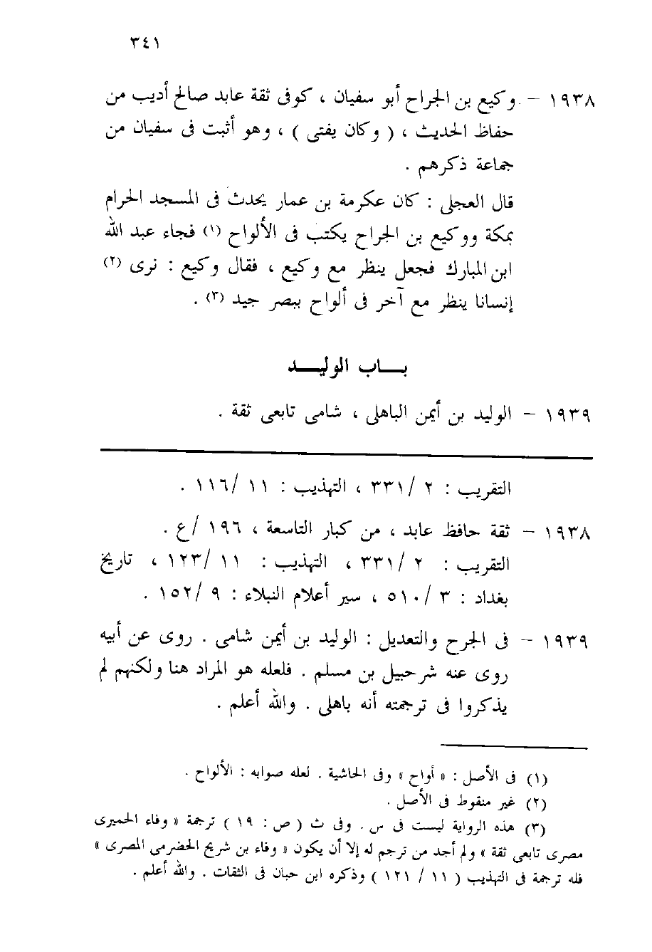 1938 - وَكِيع بن الْجراح أَبُو سُفْيَان كوفى ثِقَة عَابِد صَالح أديب من حفاظ الحَدِيث وَكَانَ يُفْتى وَهُوَ أثبت فِي سُفْيَان من جمَاعَة ذكرهم قَالَ الْعجلِيّ كَانَ عِكْرِمَة بن عمار يحدث فِي الْمَسْجِد الْحَرَام بِمَكَّة ووكيع بن الْجراح يكْتب فِي الألواح فجَاء عبد الله بن الْمُبَارك فَجعل ينظر مَعَ وَكِيع فَقَالَ وَكِيع نرى انسانا ينظر مَعَ آخر فِي أَلْوَاح ببصر جيد